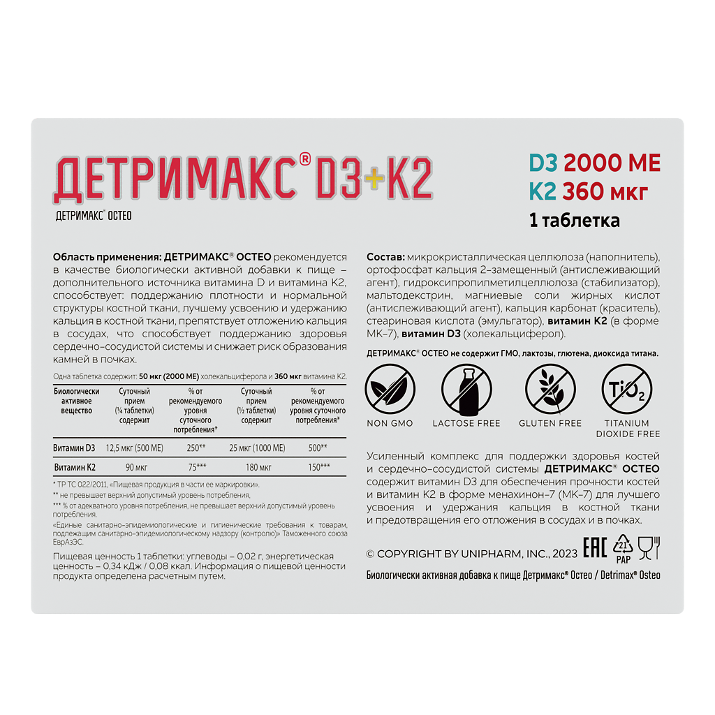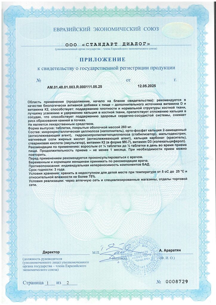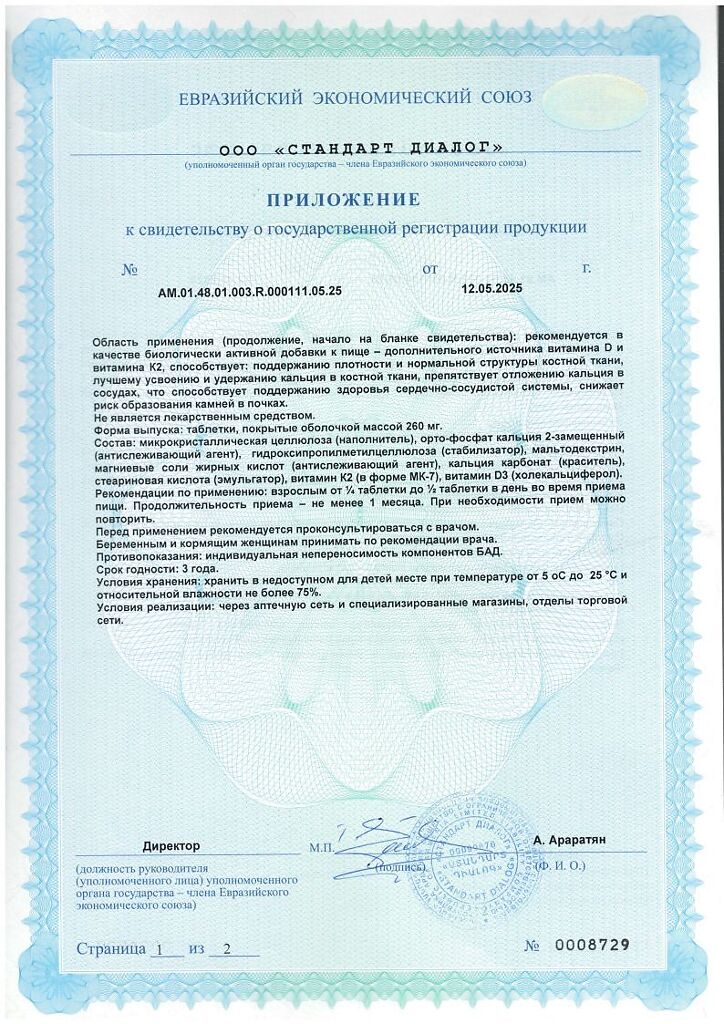 Одна таблетка содержит: 50 мкг (2000 МЕ) холекальциферола и 360 мкг витамина К2.