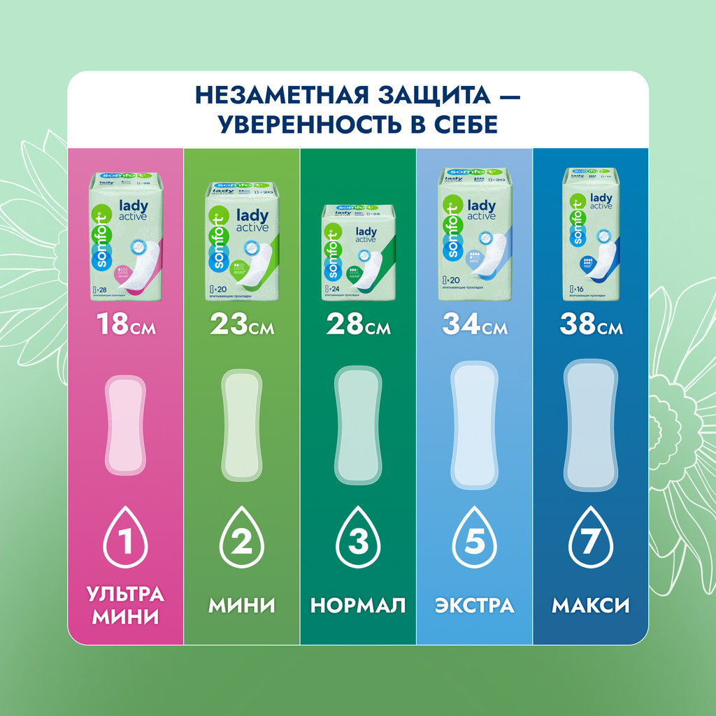 • 📲 Цена на Somfort Lady Active Прокладки тонкие впитывающие Mini 20 шт ниже в нашем приложении