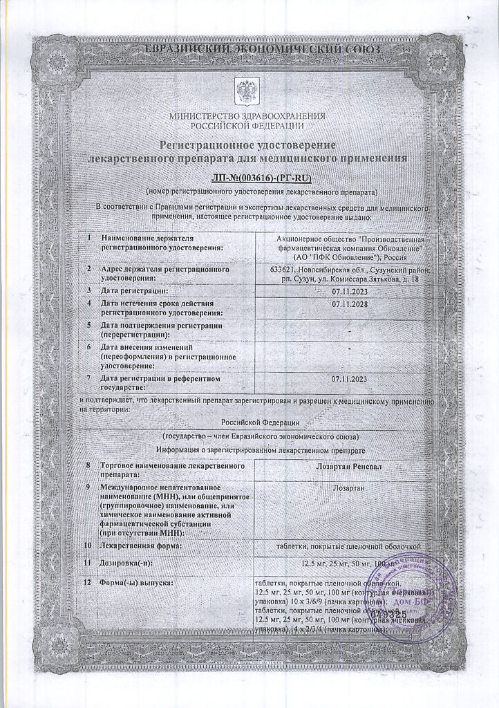 Документы Лозартан Реневал таблетки покрыт.плен.об. 50 мг 30 шт