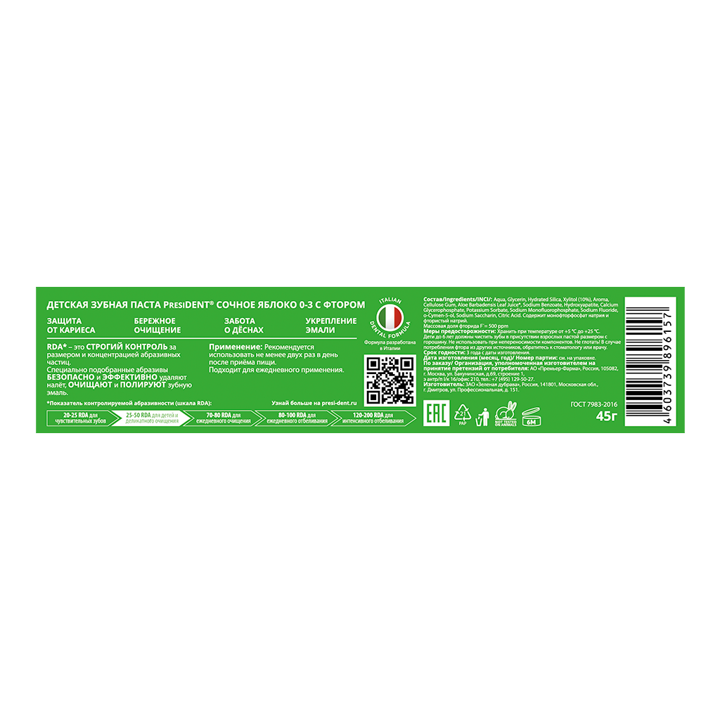 • 📒 Подробная инструкция по применению PresiDent Детская зубная паста Сочное Яблоко (RDA 25) 0-3 45 г 1 шт