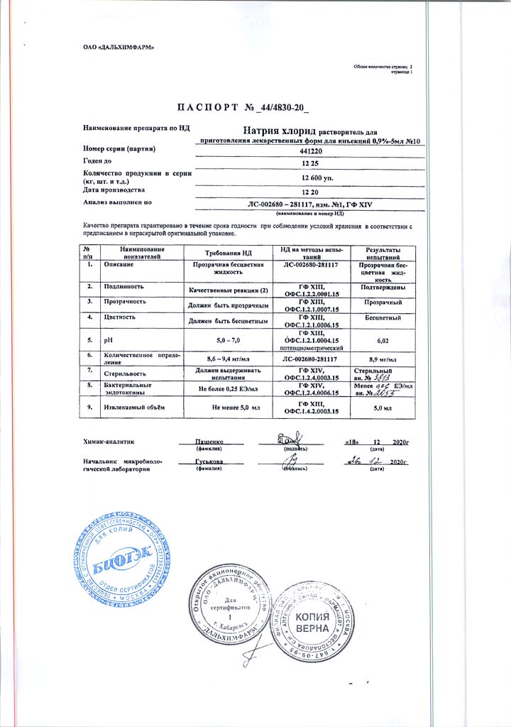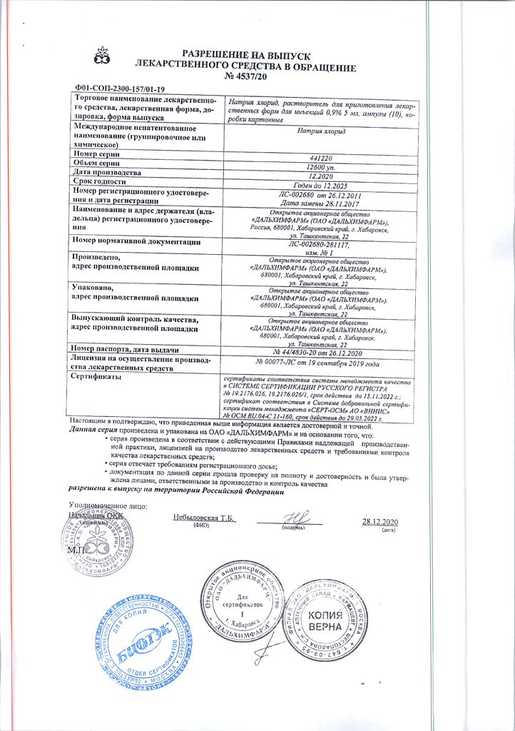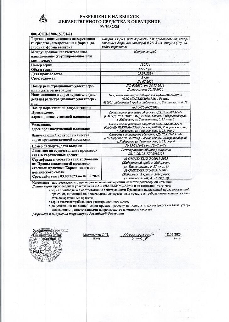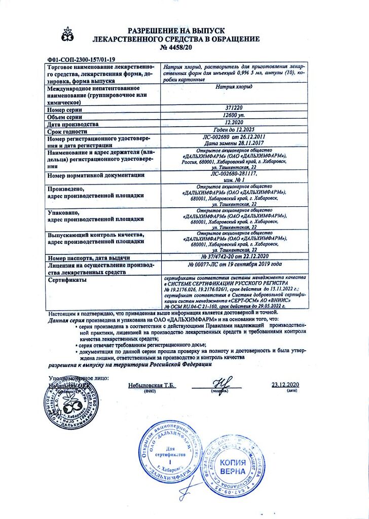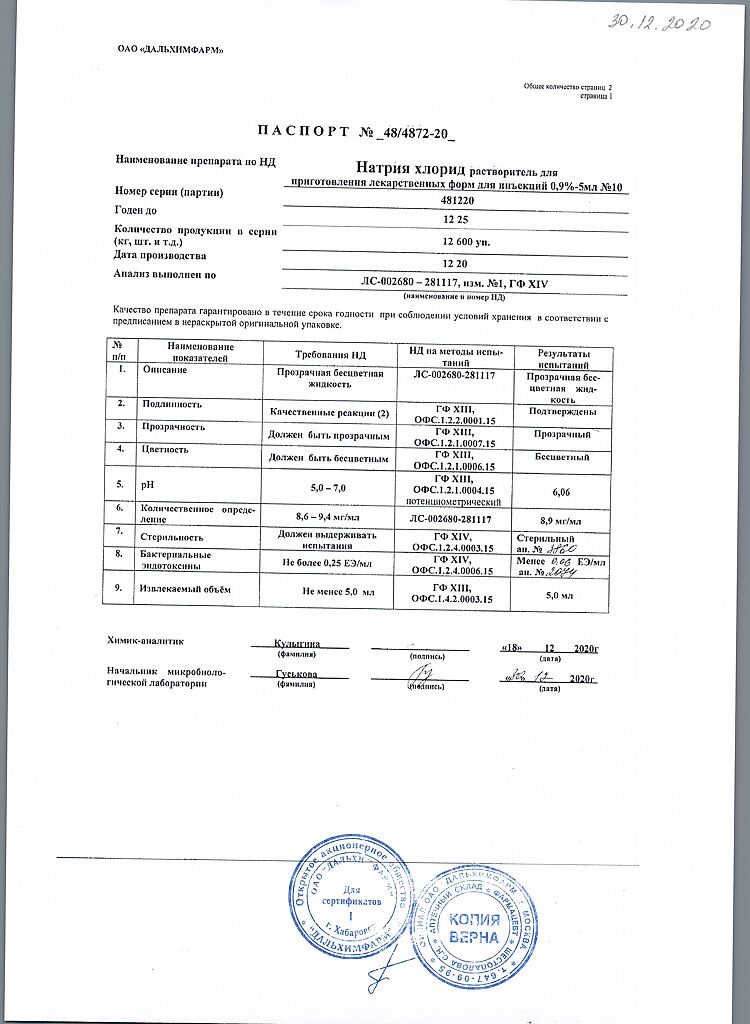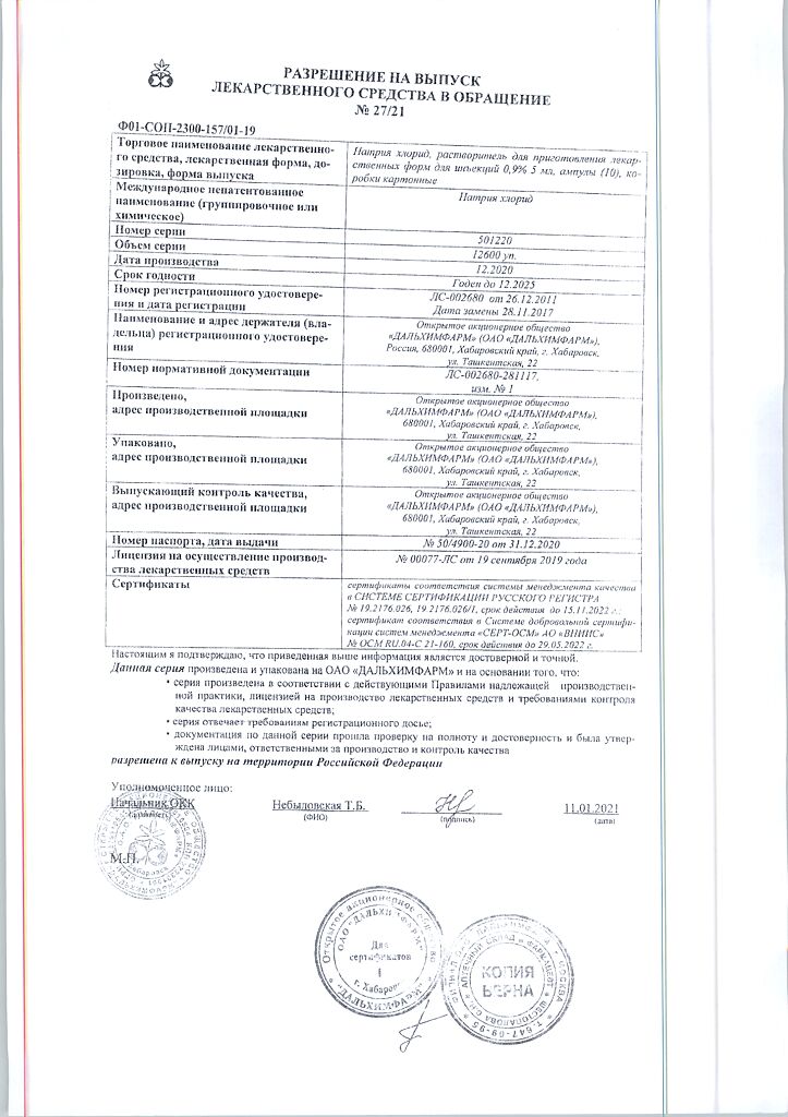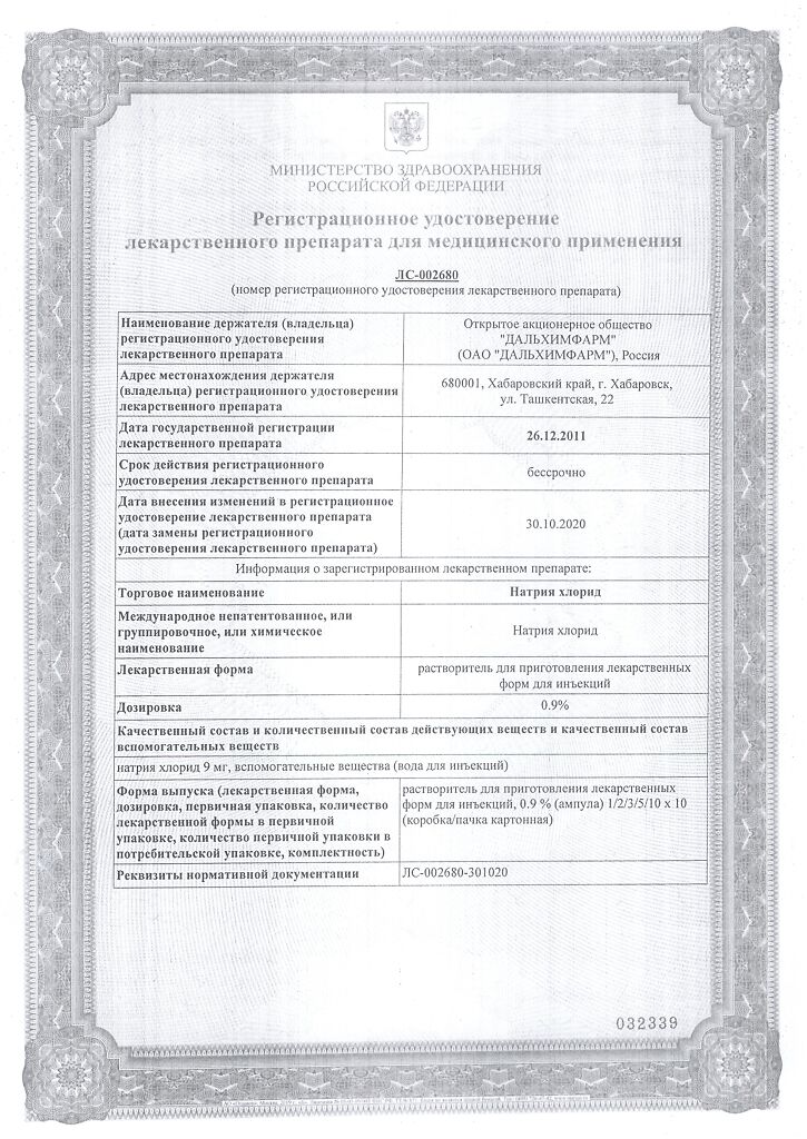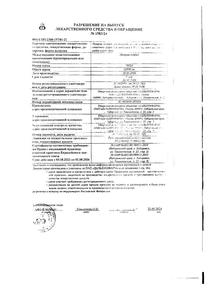 Гипертонический раствор натрия хлорида при применении в/в обеспечивает коррекцию осмотического давления внеклеточной жидкости и плазмы крови.