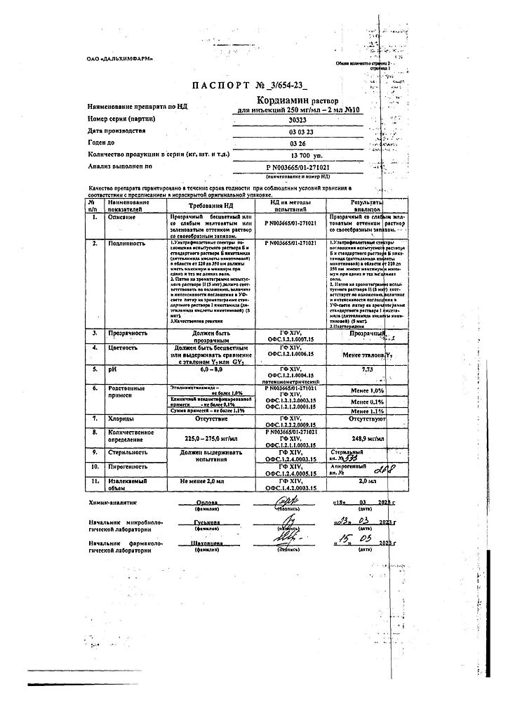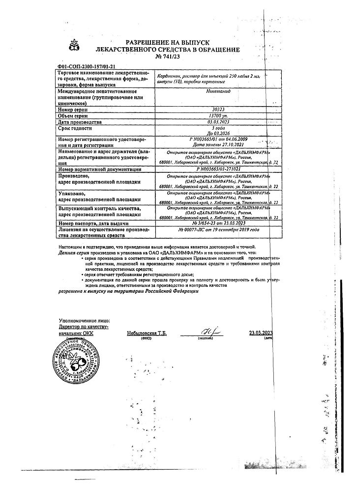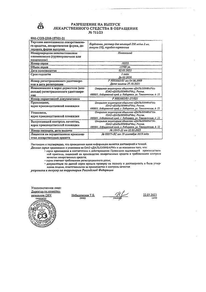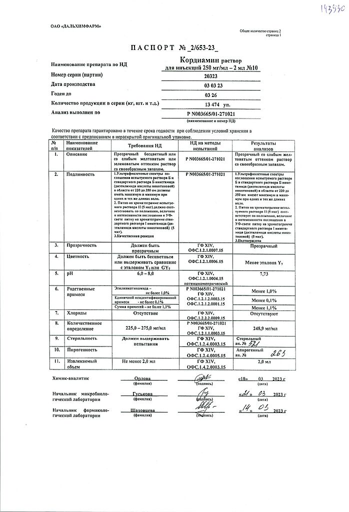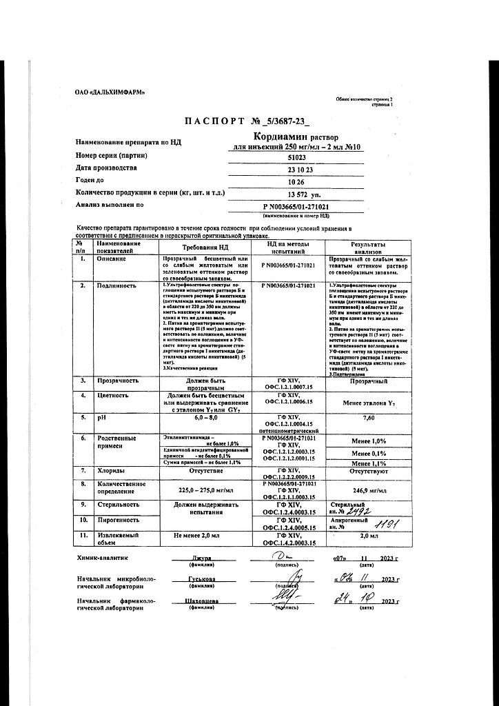 Документы Кордиамин раствор для инъекций 250 мг/мл 2 мл амп 10 шт