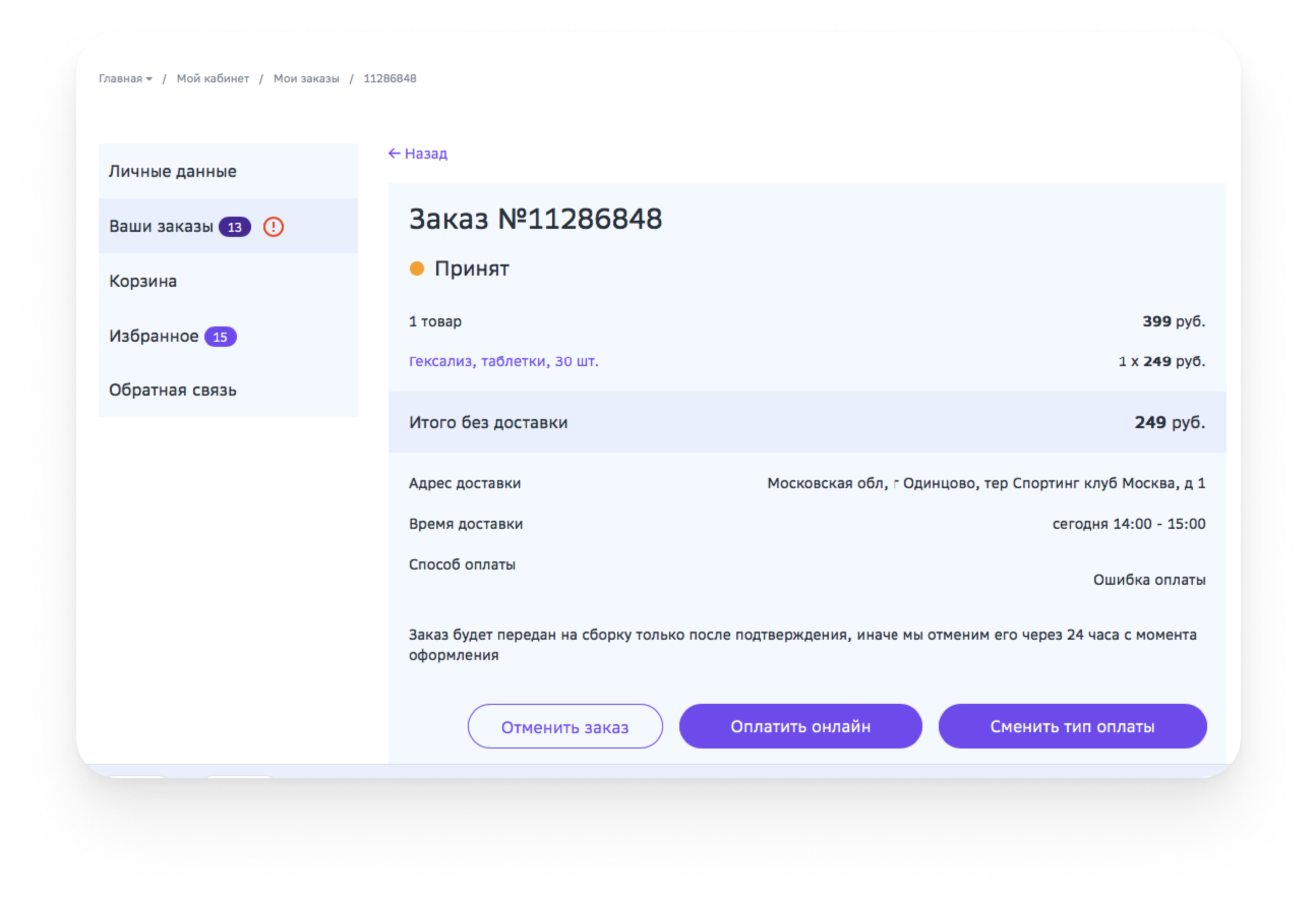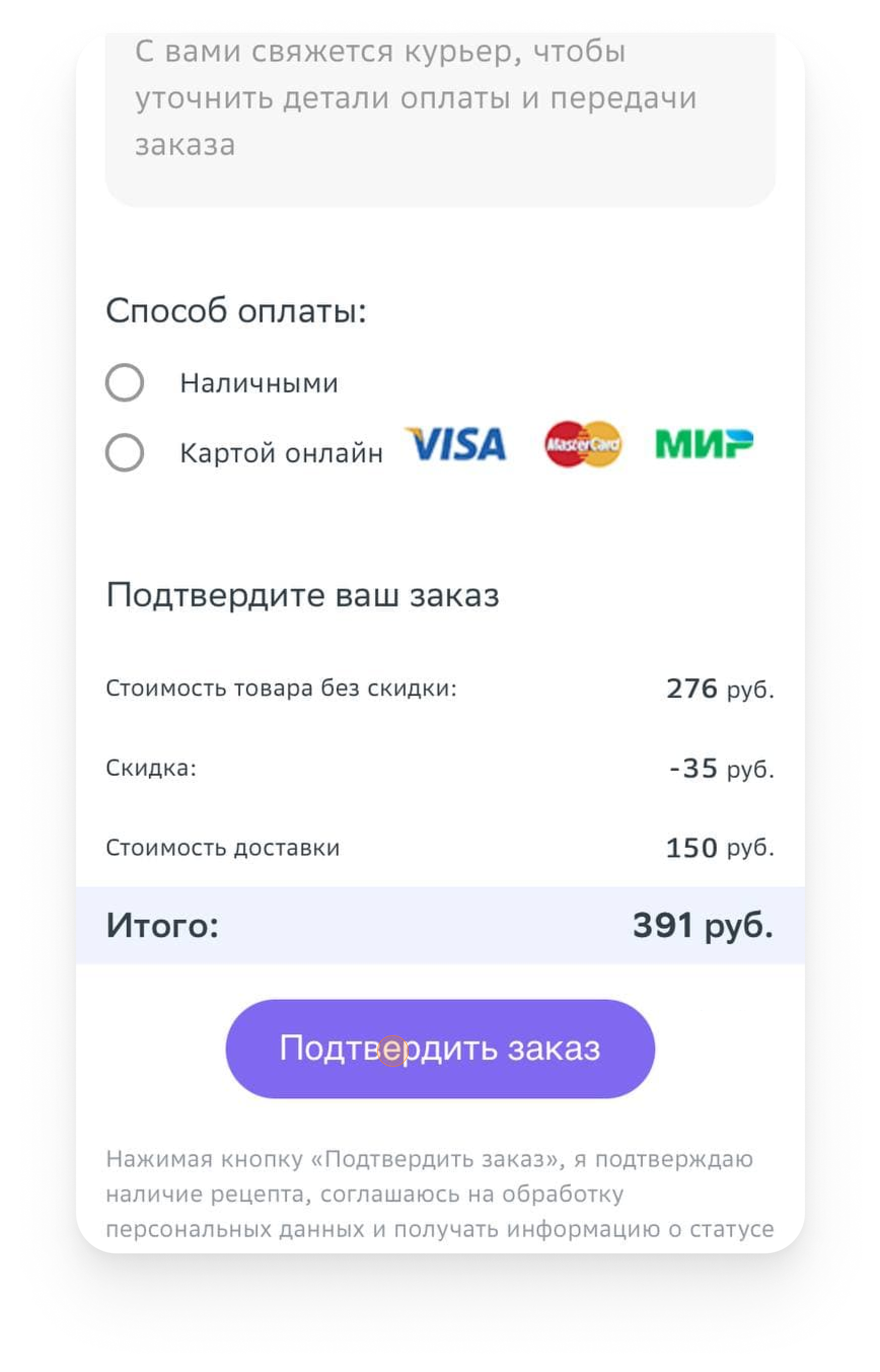 Обращаем ваше внимание, что при наличии в заказе рецептурных препаратов, спиртосодержащей продукции, а также для отдельных точек самовывоза,