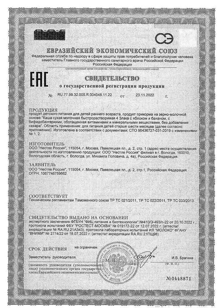 Документы Nestle Каша молочная мультизлаковая с яблоком и бананом с пробиотиком BL с 6 мес пакет 200 г 1 шт