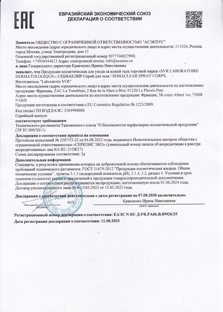 Документы SVR Sebiaclear Спрей для тела 150 мл 150 мл 1 шт