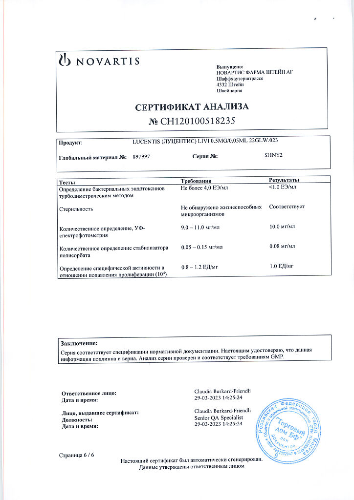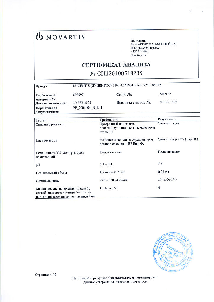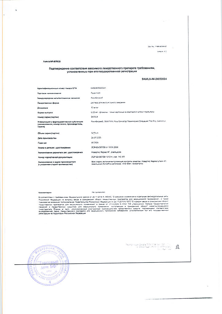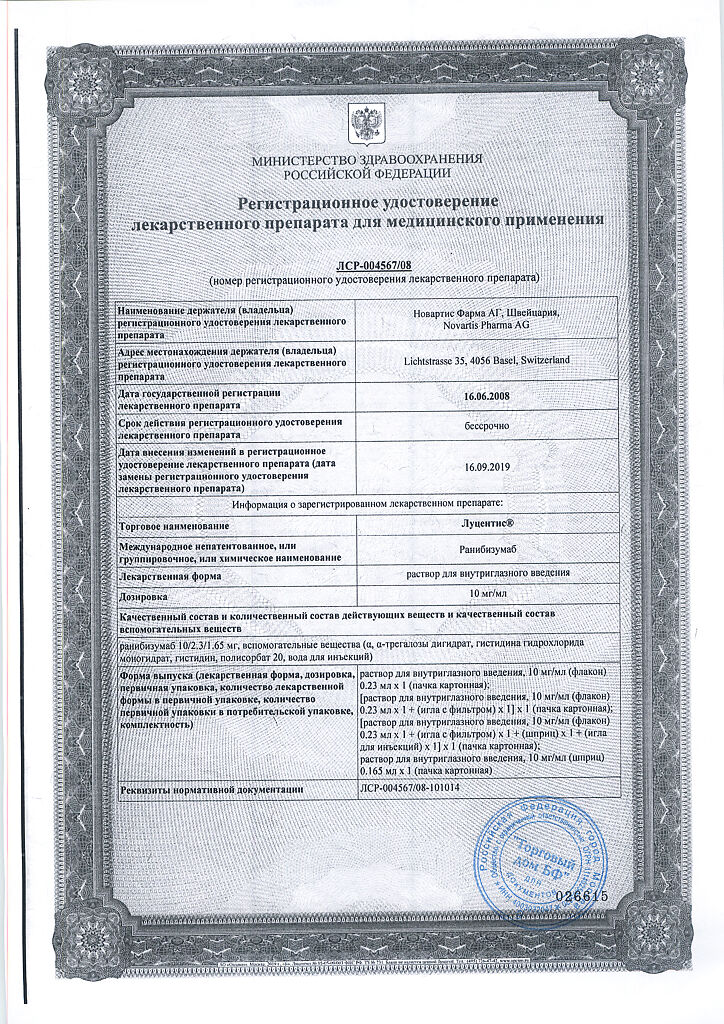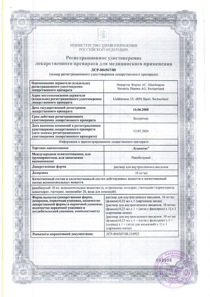Луцентис раствор для внутриглазного введ 10 мг/мл 0,23 мл