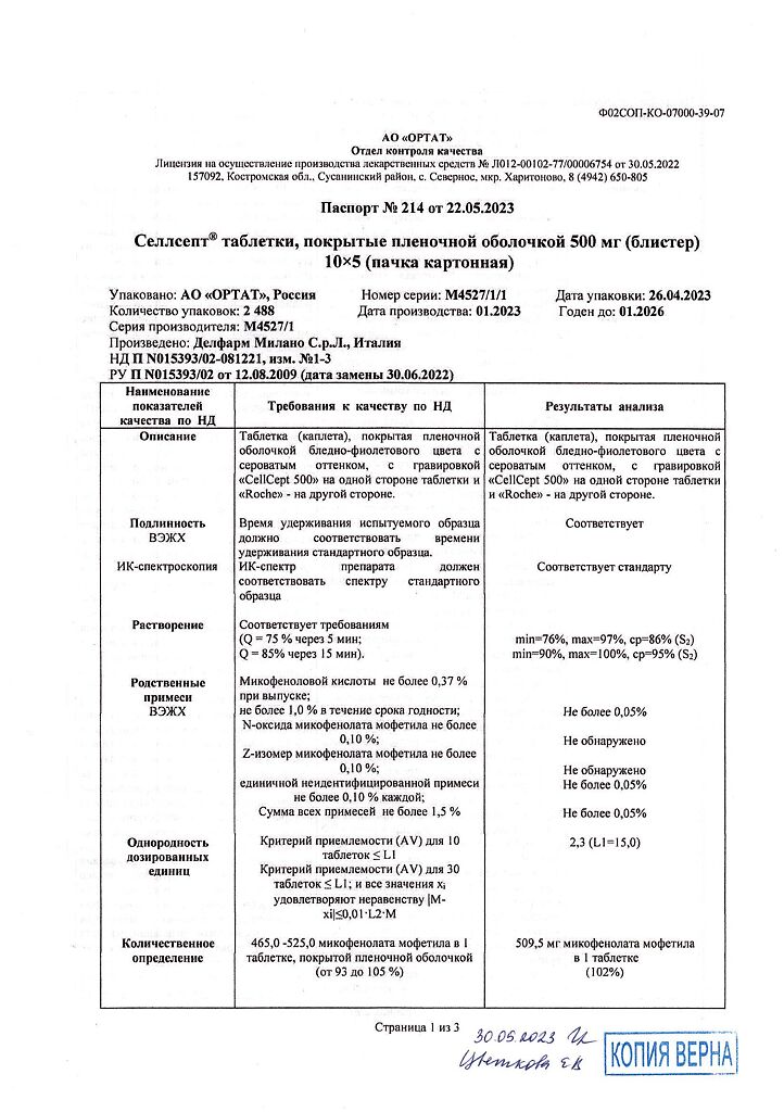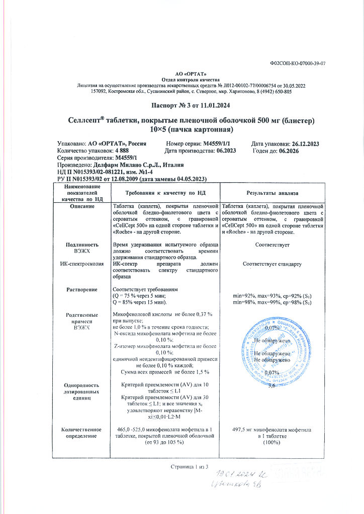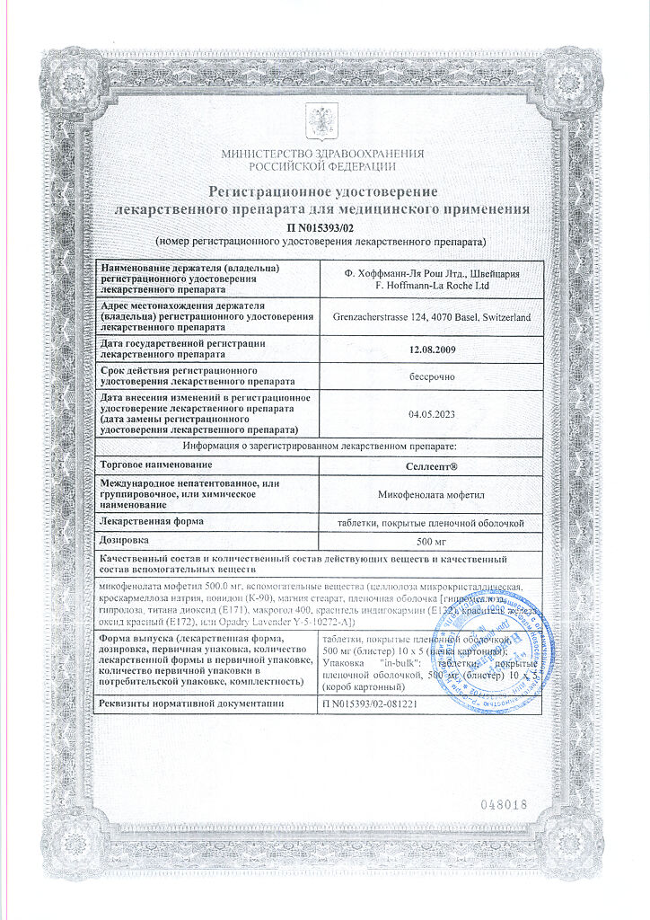 Селлсепт таблетки покрыт.плен.об. 500 мг 50 шт