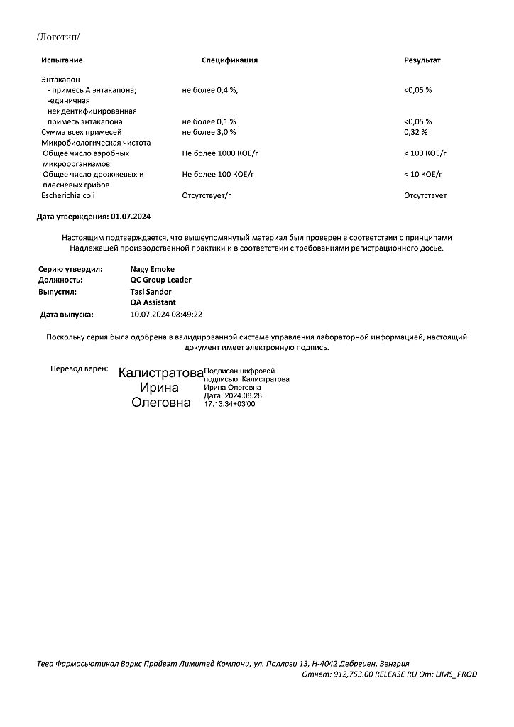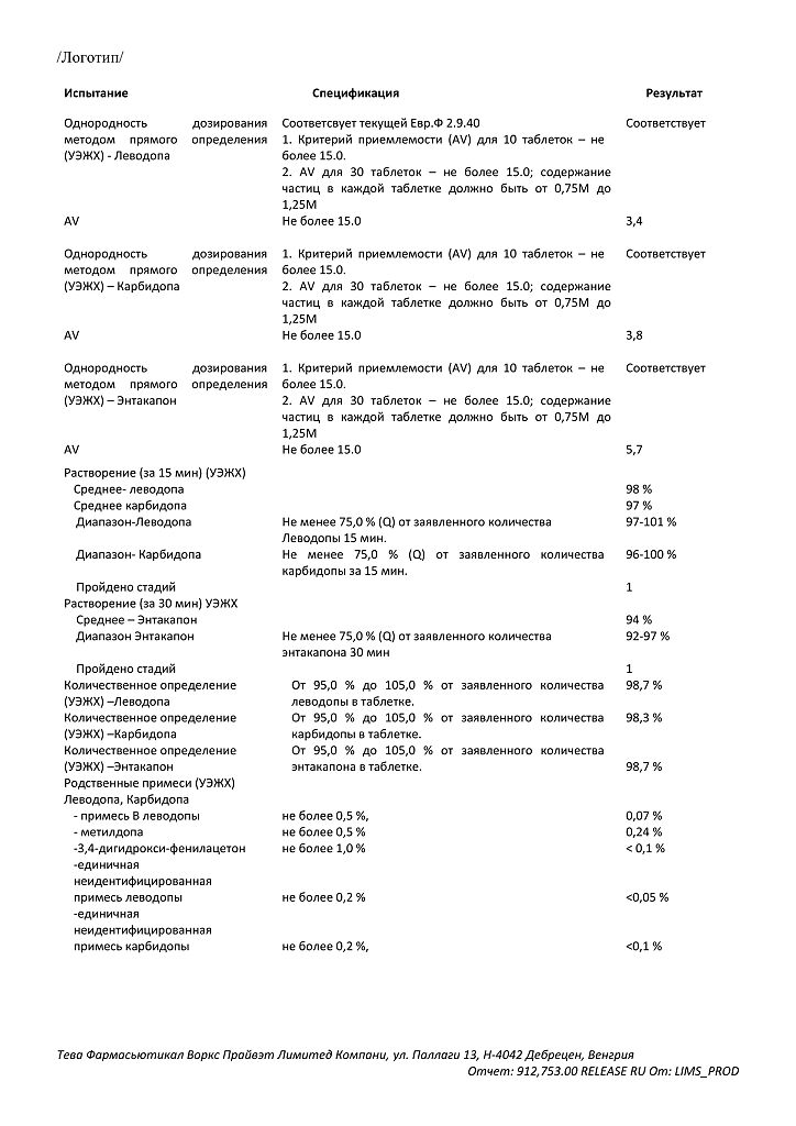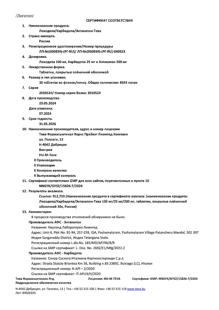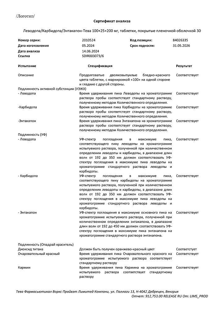 Леводопа/Карбидопа/Энтакапон-Тева таблетки покрыт.плен.об. 100 мг+25 мг+200 мг 30 шт
