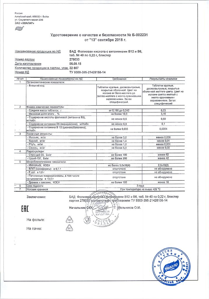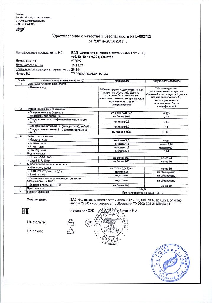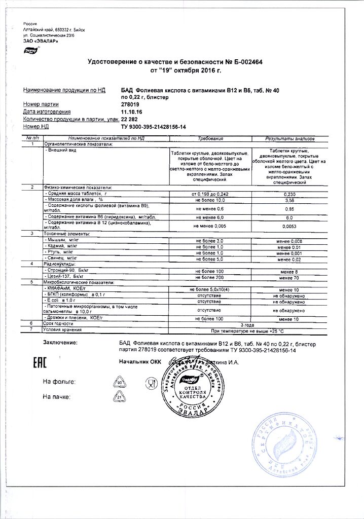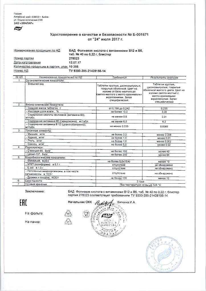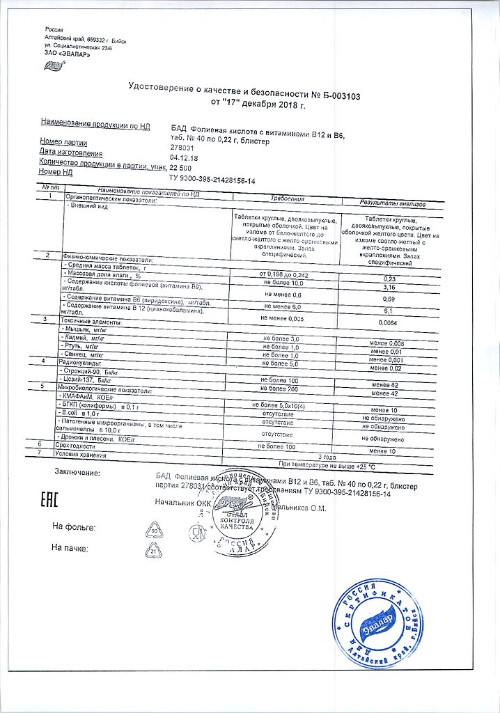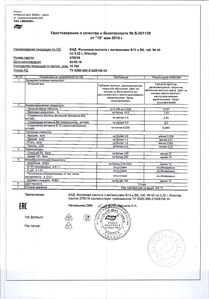 Документы Фолиевая кислота 600 мкг с витаминами В12 и В6 таблетки массой 0,22 г 40 шт
