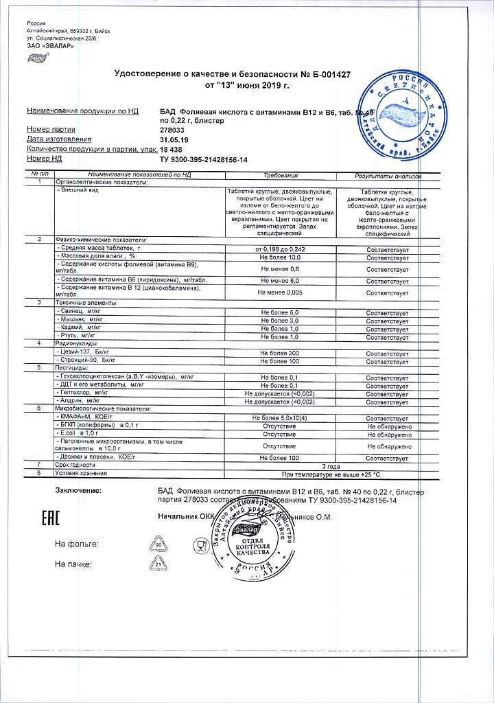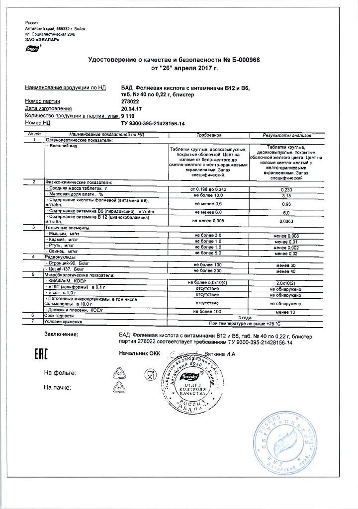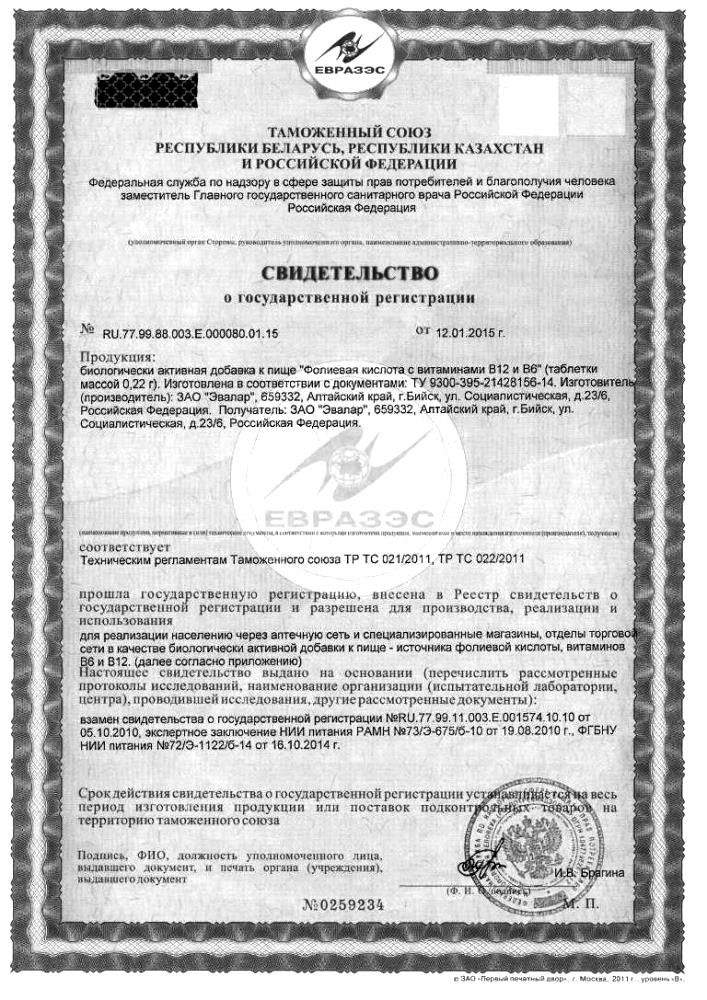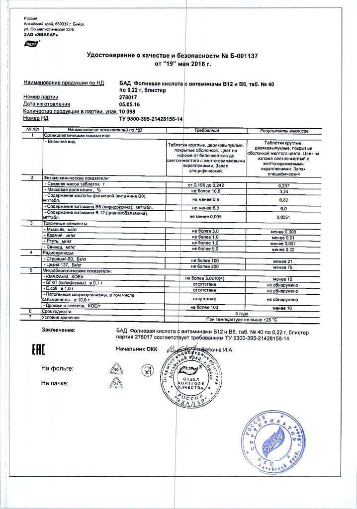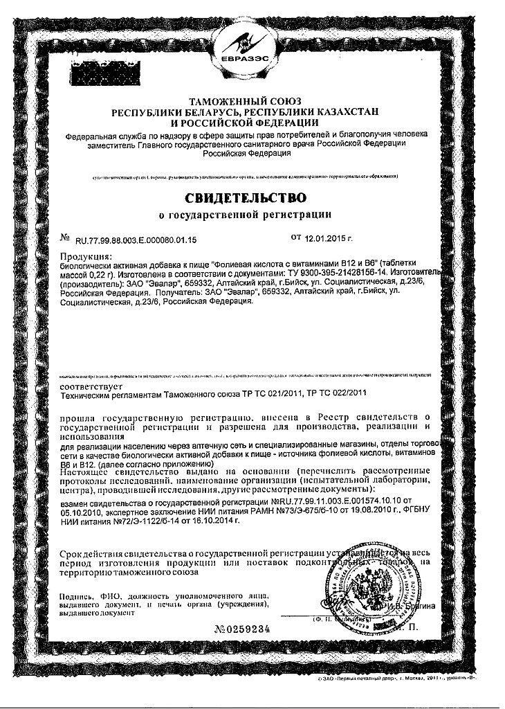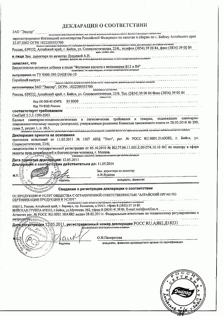 Документы Фолиевая кислота 600 мкг с витаминами В12 и В6 таблетки массой 0,22 г 40 шт