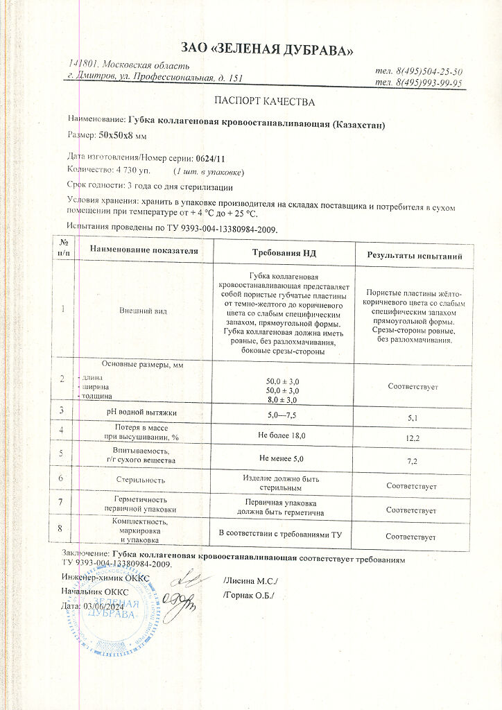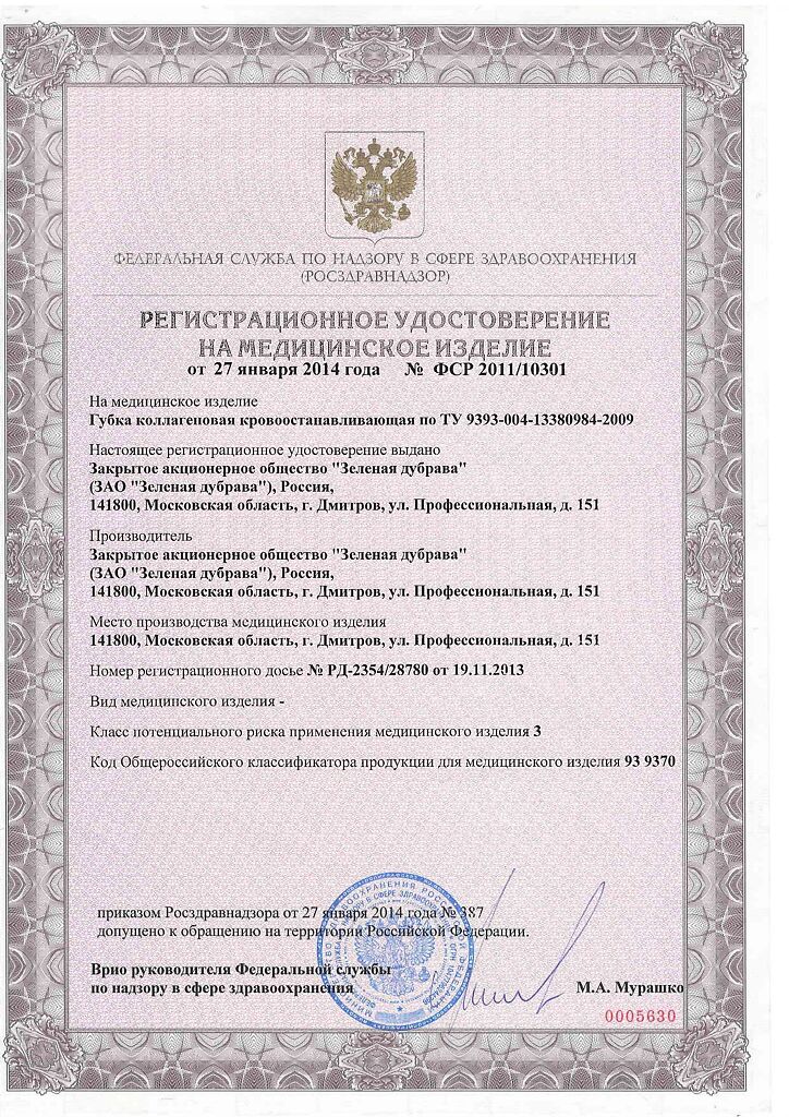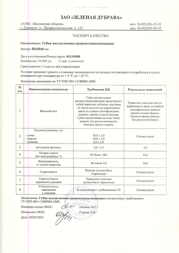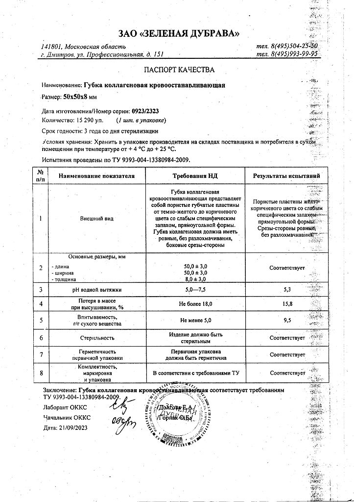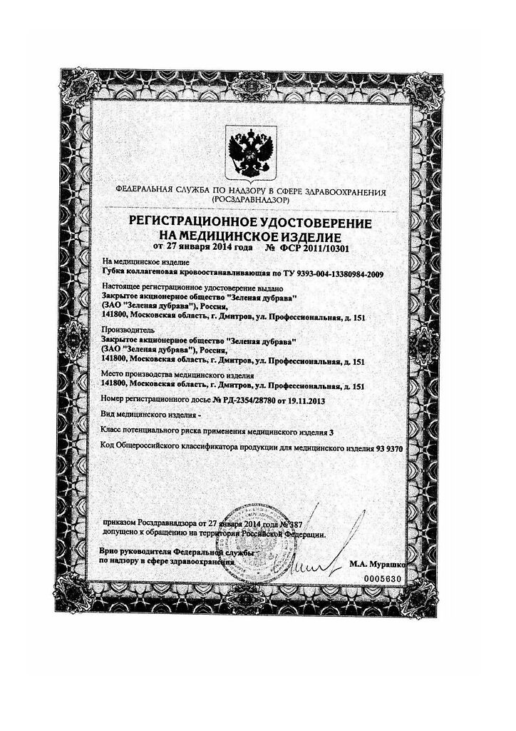 Документы Губка кровоостанавливающая коллагеновая 50х50 мм 1 шт
