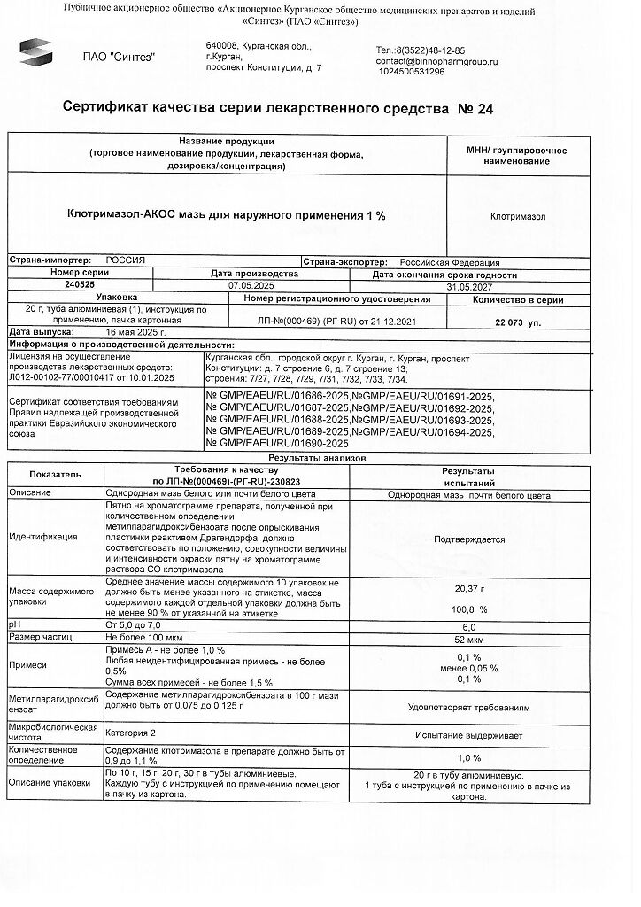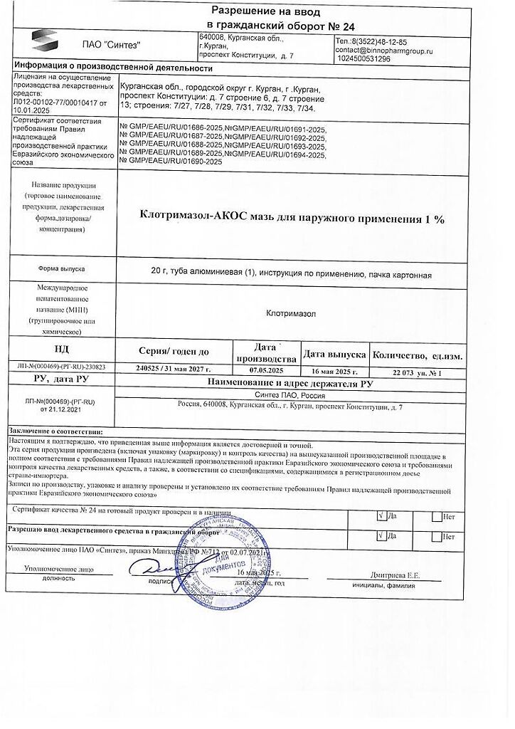 Документы Клотримазол-АКОС мазь для наружного применения 1 % 20 г 1 шт