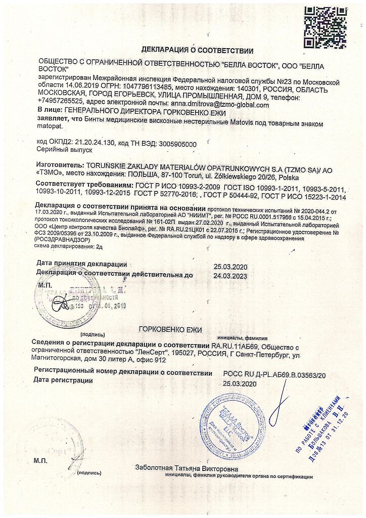 Документы Бинт медицинский Матопат Matovis нестерильный вискозный 15 см х 4 м 1 шт