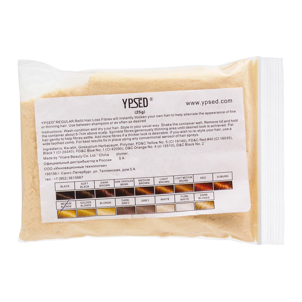 Кератиновый камуфляж (загуститель) волос YPSED серия Regular (Medium blonde средний блонд) – это высокотехнологичные кератиновые волокна, состоящие из натурального кератина, нарезанные и обработанные таким образом, что они незаметно смешиваются с волосами, визуально увеличивая густоту и объем. Используя загуститель, достаточно просто превратить жидкие прядки в густую шевелюру. Средство отлично маскирует проплешины, рубцы на коже, редкие проборы, небольшие залысины. Продукт выпускается в разных оттенках, поэтому подобрать загуститель можно к любому натуральному цвету волос. Волосы обладают статическим электричеством, за счет этого волокна беспорядочно прилепляются к волосам, зрительно делая их гуще. Достаточно покрыть средством голову и через 10 секунд оценить результат: проблемных зон не будет видно. Плюсом сухого загустителя является то, что это очень быстрый и наипростейший способ скрыть дефект прически, средство можно взять с собой в поездку и пользоваться им в любых обстоятельствах. Волокна достаточно хорошо прикрепляются к волосам, но все же специалисты рекомендуют дополнительно применять фиксирующие средства (лак для волос), чтобы еще сильнее закрепить загуститель. Подходит для применения как мужчинам так и женщинам, помогает в любой ситуации выглядеть достойно и чувствовать себя уверенно. Рекомендованное количество для единоразового использования - 0,5гр.