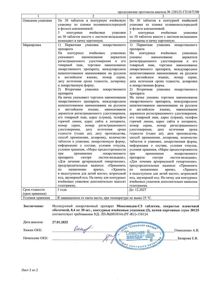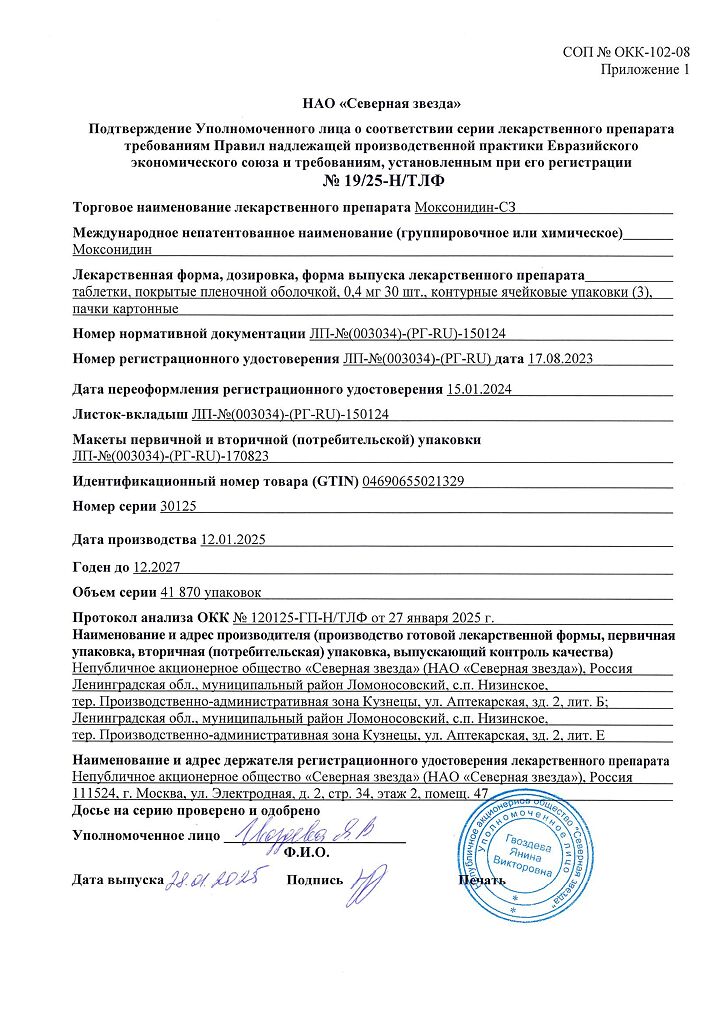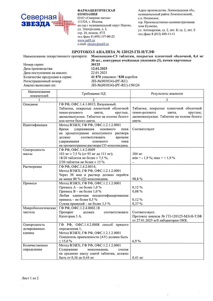 вспомогательные вещества (оболочка): Опадрай II (спирт поливиниловый, частично гидролизованный -; 1,32 мг; титана диоксид Е 171 -0,5751 мг; тальк -0,6 мг; макрогол (полиэтиленгликоль 3350) - 0,3705 мг; лецитин соевыйФармакотерапевтическая группа лекарственного препарата: Гипотензивное средство центрального действия.