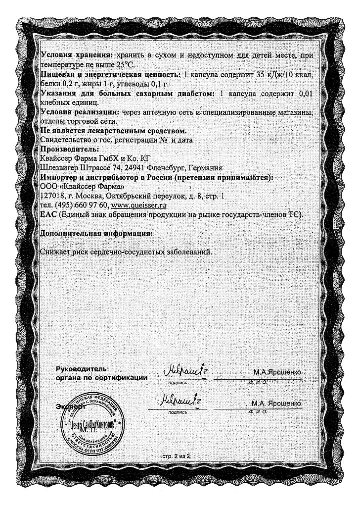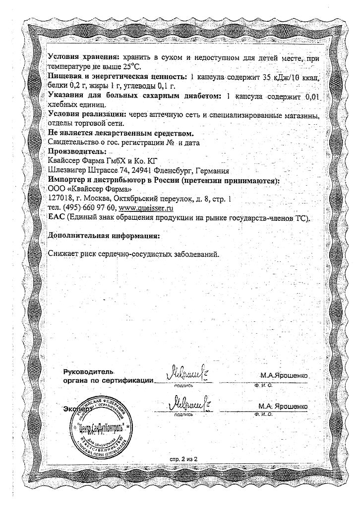 Пищевая и энергетическая ценность: 1 капсула содержит 34 кДж/8 ккал, белки 0,2 г, жиры 0,8 г, углеводы 0,1 г.