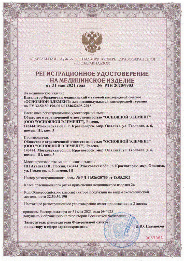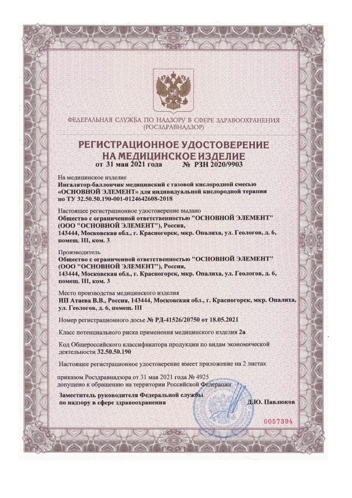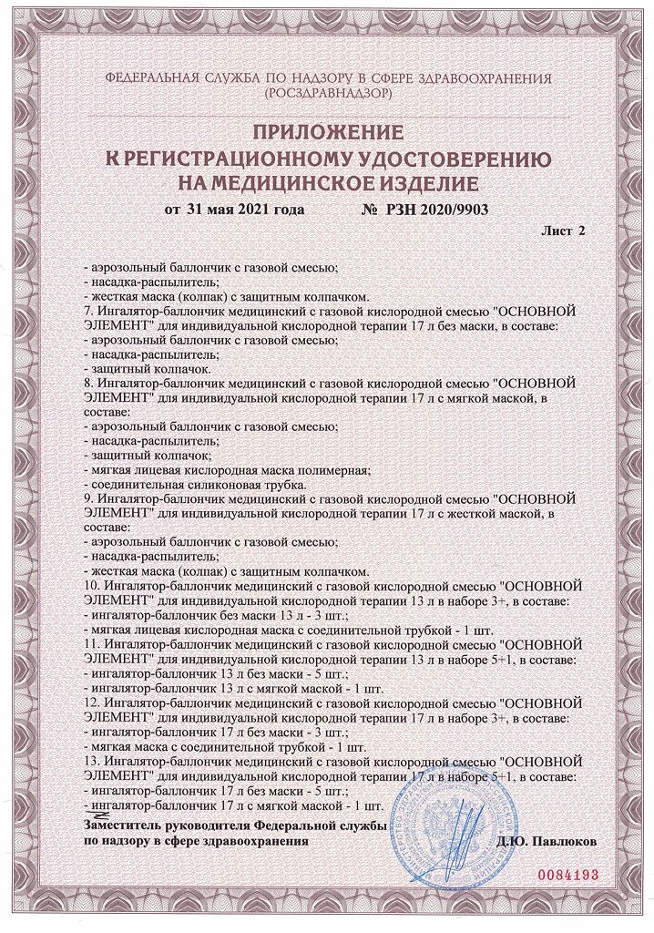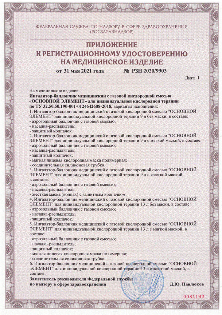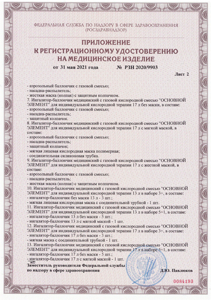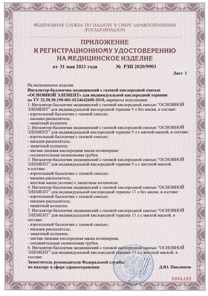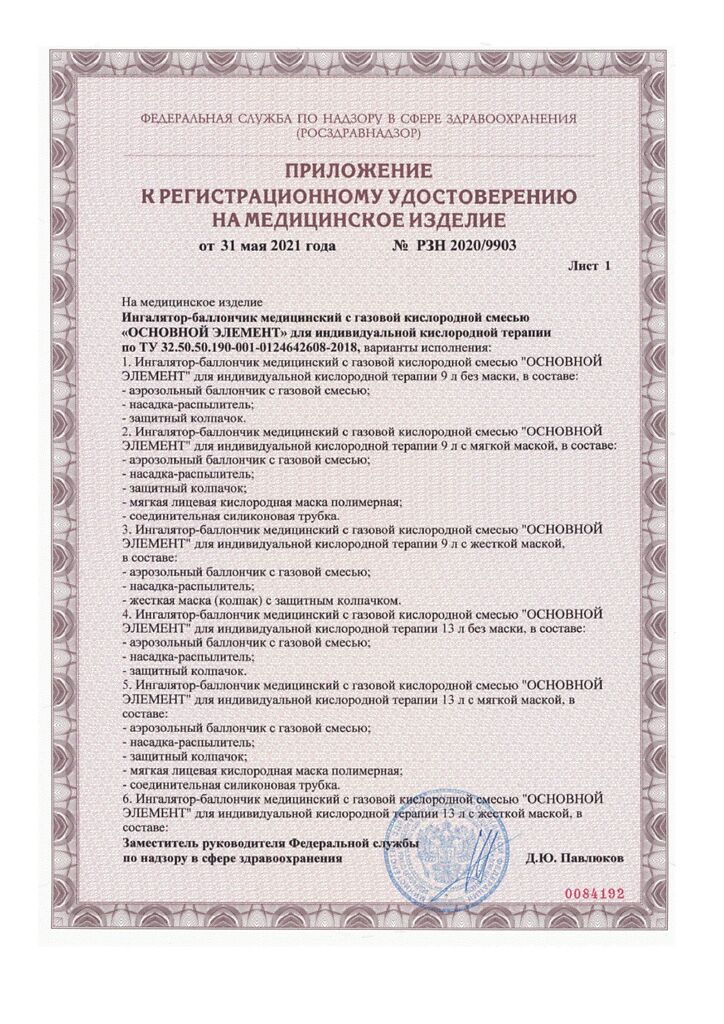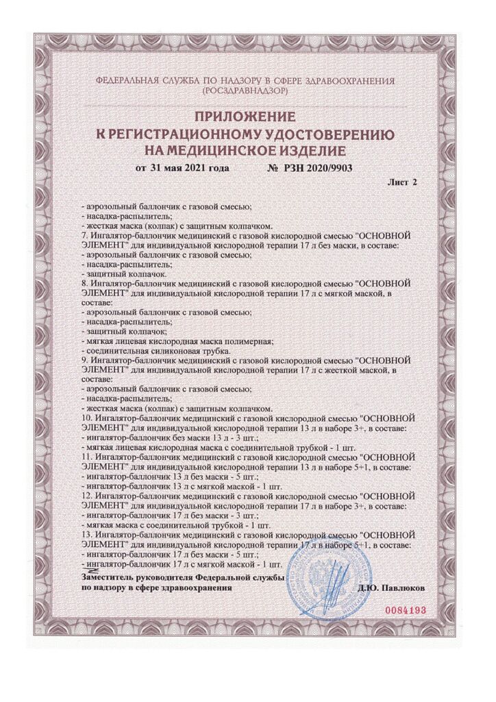 Документы Основной Элемент Ингалятор-баллончик с газовой кислородной смесью 9 л с мягкой маской 1 шт