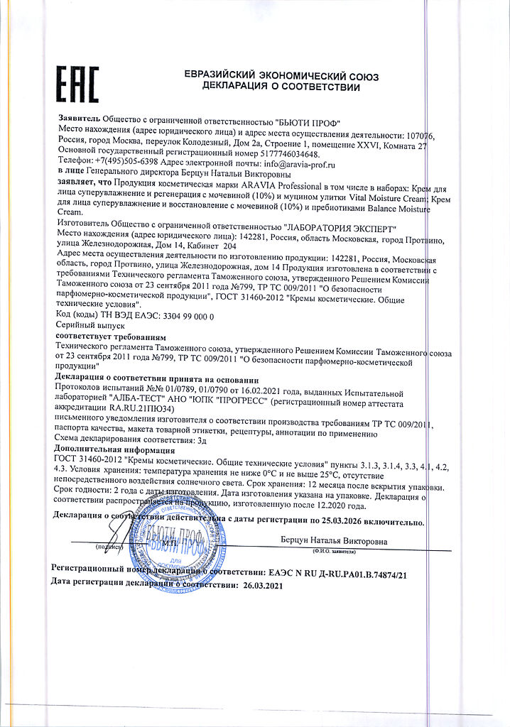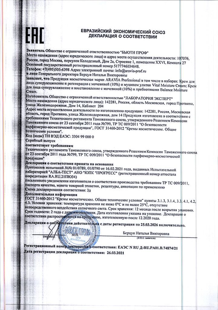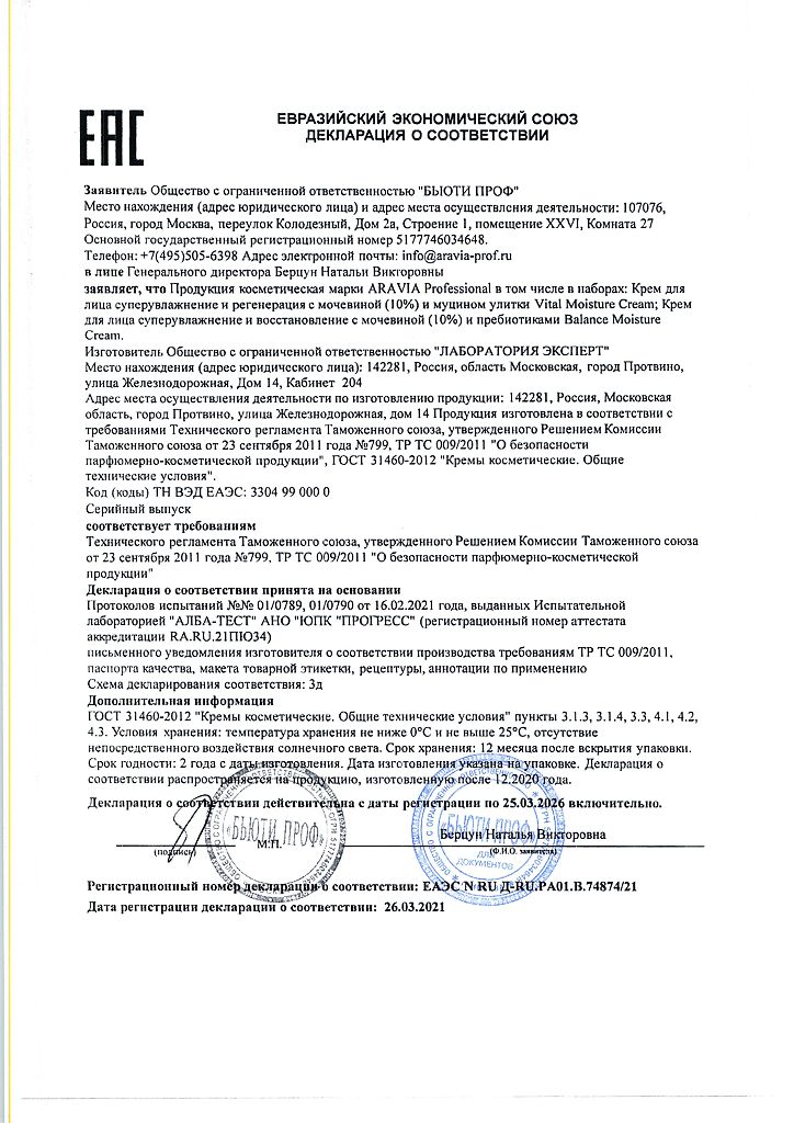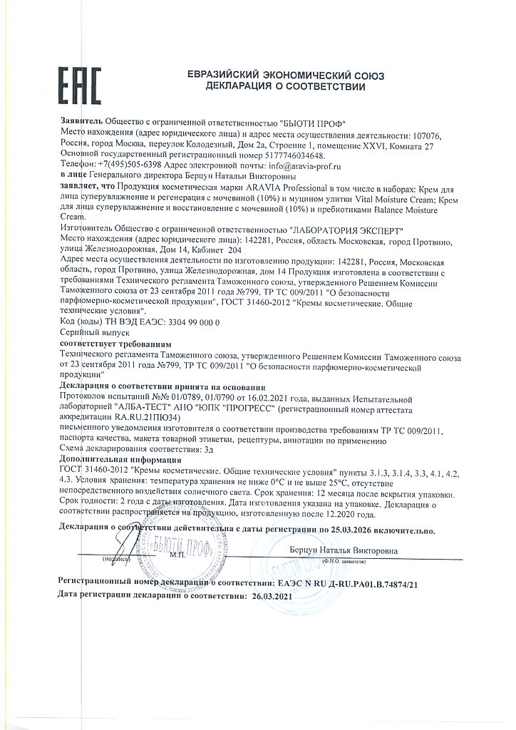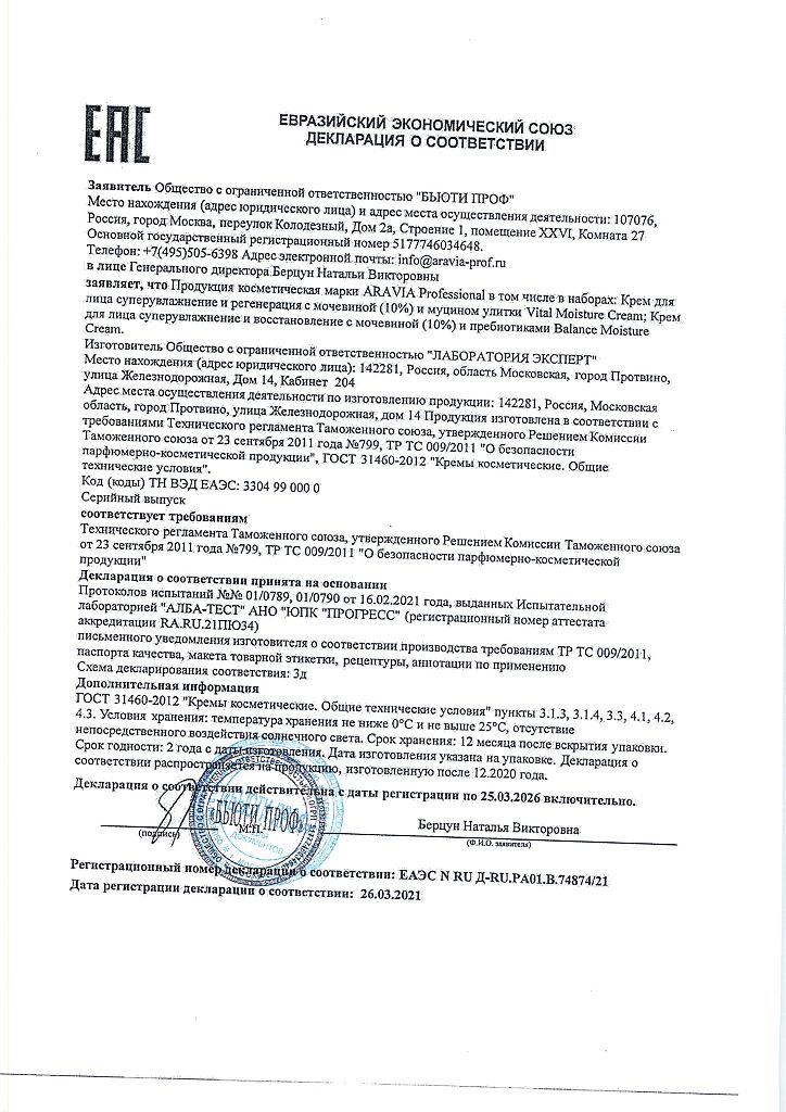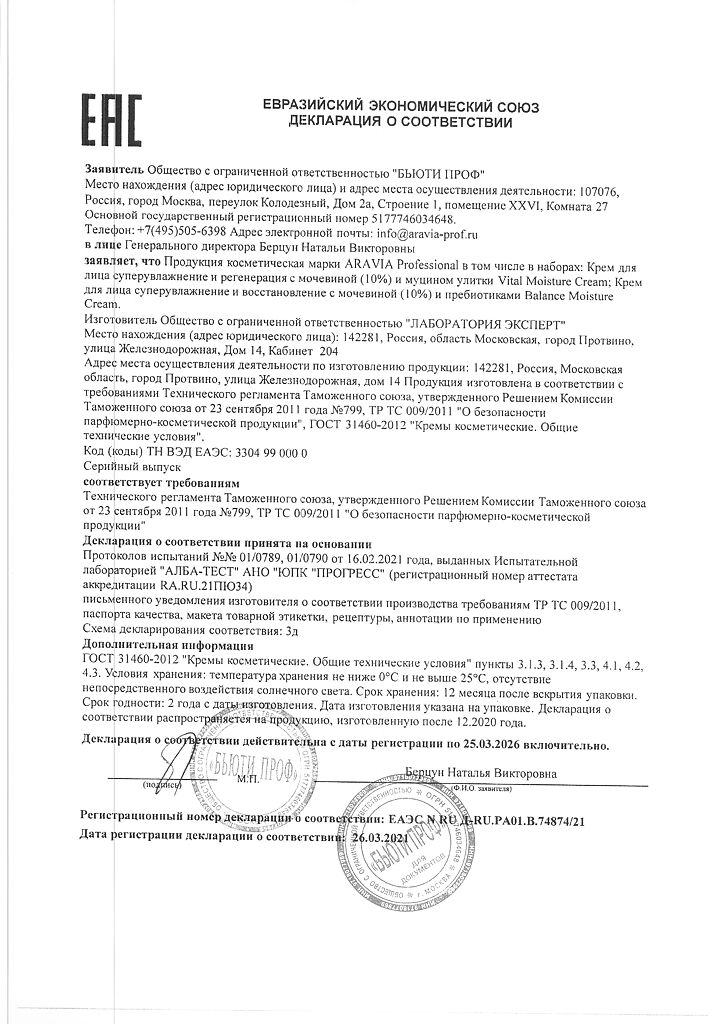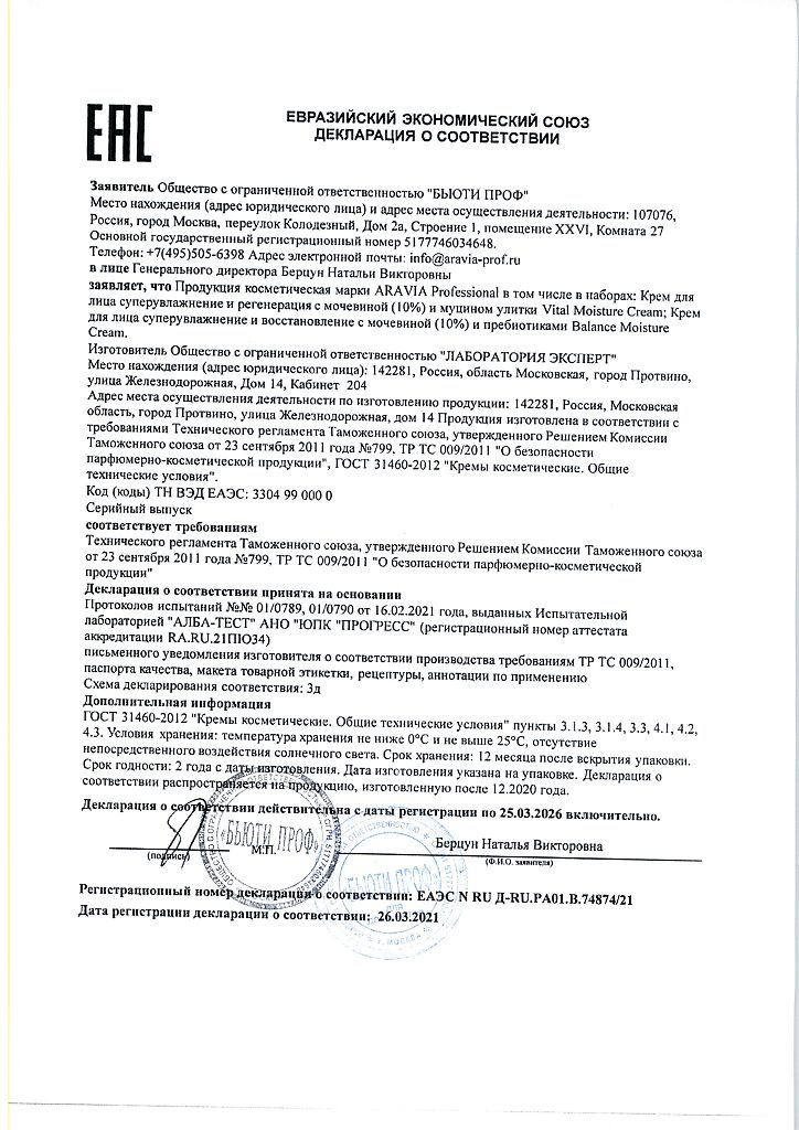 Документы Aravia Professional Крем для лица суперувлажнение и восстановление с мочевиной (10%) и пребиотиками Balance Moisture Cream 150 мл 1 шт