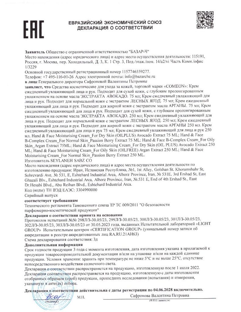 Документы Крем COME'ON для жирного типа кожи лица и рук увлажняющий с маслом арганы 75 мл 1 шт