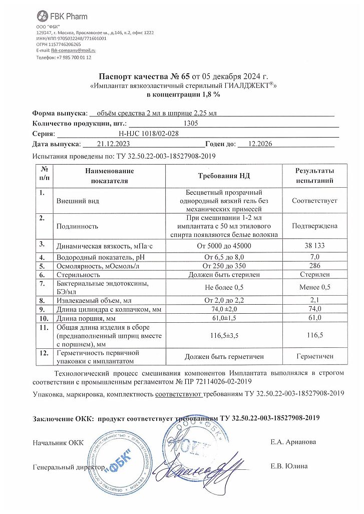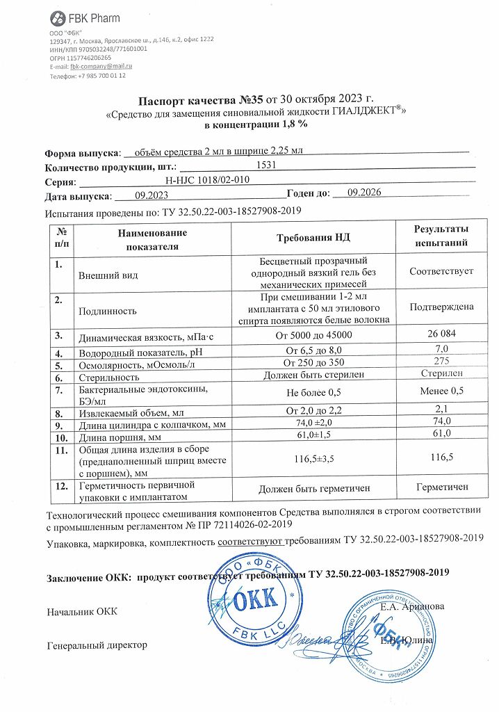 Документы Гиалджект имплантат вязкоэластичный стерильный 1,8% 2 мл шприц 1 шт