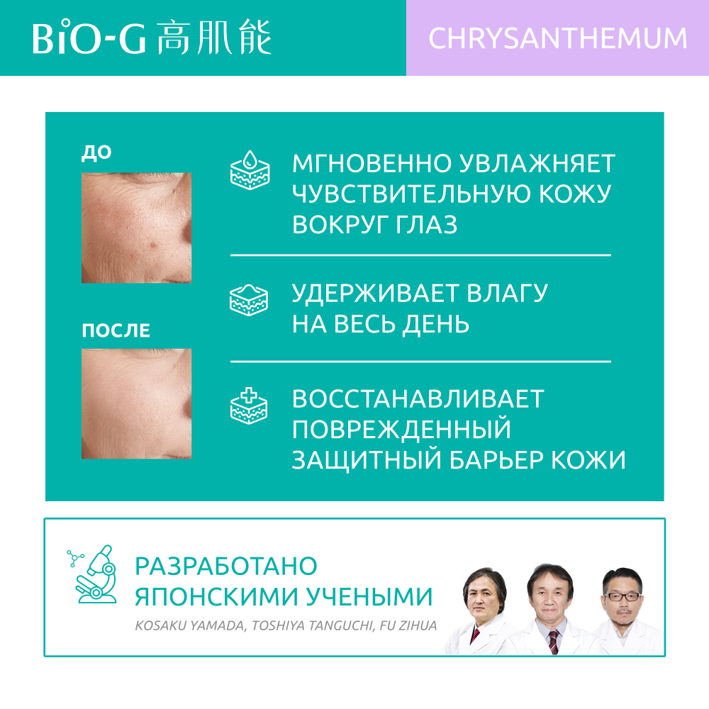 Эссенция Bio-G Chrysanthemum Eye Essence – нежное увлажняющее, успокаивающее и восстанавливающее средство для завершающего этапа ухода за чувствительной кожей вокруг глаз. При регулярном использовании интенсивно насыщает нежную кожу век влагой, смягчает и сглаживает тонкие линии сухости и мимические морщины, уменьшает воспаления, покраснения, шелушения, восстанавливает кожный барьер и снижает чувствительность к негативным факторам окружающей среды. Тающая, шелковистая текстура крема для век легко распределяется и быстро впитывается без ощущения липкости и жирности на коже. Имеет едва уловимый косметический аромат. Увлажняющая формула крема вокруг глаз Bio-G разработана на базе научно-исследовательского центра в Японии Hondo R&D Center. Комбинация из трёх суперувлажняющих компонентов – ксилитилглюкозида, ангидроксилитола и ксилитола – обеспечивает моментальное и длительное увлажнение эпидермиса и увеличивает запасы молекул воды в глубоких слоях кожи. Экстракт хризантемы – природный антиоксидант, который бережно успокаивает кожу и снимает раздражение, улучшает текстуру кожи, помогает в борьбе со старением и содержит природные UV-фильтры. Запатентованный омолаживающий ингредиент Tiracle Pro стимулирует процессы самоочищения и обновления клеток кожи: способствует выведению свободных радикалов и воспалительных стрессовых факторов из клеток кожи, защищает мембранные липиды от окисления, регулирует работу водных каналов, обеспечивая доставку влаги в обезвоженные слои кожи и её удержание. Anti-age пептид аргирелин – безопасная альтернатива ботоксу – расслабляет мимические мышцы и разглаживает «гусиные лапки» в уголках глаз. Масло ши питает, смягчает, повышает эластичность и восстанавливает повреждённую кожу. Фитостеролы рапсового масла, бисаболол и пантенол (провитамин B5) снимают раздражение, сухость и шелушение кожи, успокаивают и стимулируют обновление клеток эпидермиса. А мощный антиоксидант – витамин Е (токоферол и токоферил ацетат) – способствует заживлению ран, сокращению возрастной пигментации и глубины мимических морщин.