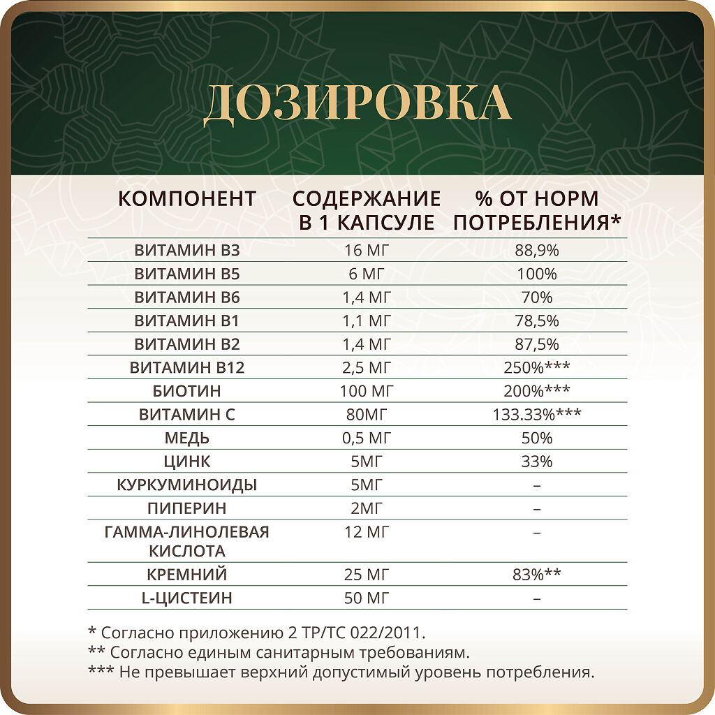 Гипромеллоза (растительная оболочка капсулы), рисовая мука, Витамин С (в виде кальция аскорбата), L-цистеин, Кремний (из экстракта бамбука), Витамин ВЗ (в виде никотинамида), Гамма - линолевая кислота (из масла огуречника), Витамин В5 (в виде кальция L - пантотената), Пиколинат цинка, Куркуминоиды (из куркумы), диоксид кремния (агент анти - слеживающий), стеарат магния (эмульгатор), микрокристаллическая целлюлоза (эмульгатор), Пиперин, Витамин В2 (в виде рибофлавина), Витамин В6 (в виде пиридоксина гидрохлорида), Витамин В1 (в виде тиамина мононитрата), Бисглицинат меди, Биотин (в виде D-биотина), Витамин В12 (в виде метилкобаламина).