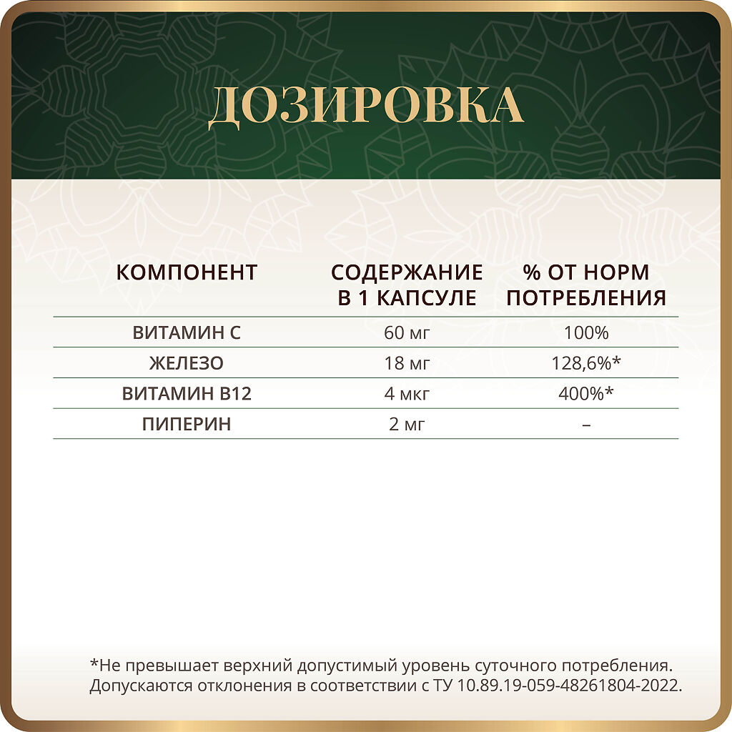 Железа аминокислотный хелат (железа бисглицинат), L-аскорбиновая кислота (витамин С), целлюлоза микрокристаллическая (носитель); капсула: гидроксипропилметилцеллюлоза (загуститель); стеарат магния и диоксид кремния аморфный (агенты антислеживающие); экстракт черного перца (пиперин), метилкобаламин (витамин B12).