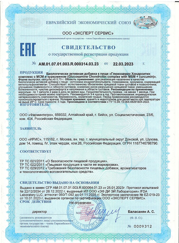 Рекомендуется в качестве биологически активной добавки к пище - источника хондроитинсульфата, глюкозамина, куркумина, содержащей метилсульфонилметан.
