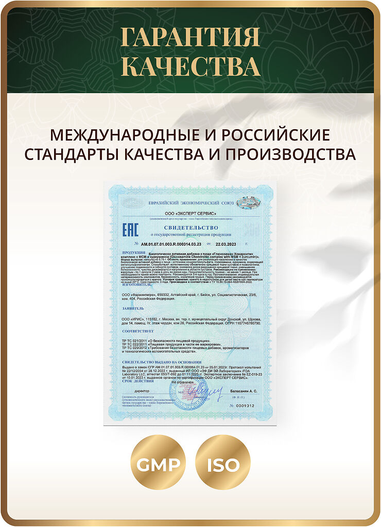 Хондроитинсульфат натрия, глюкозамина гидрохлорид, компонент капсулы: желатин; метилсульфонилметан, куркумы экстракт, стеарат магния и диоксид кремния аморфный (агенты антислеживающие).