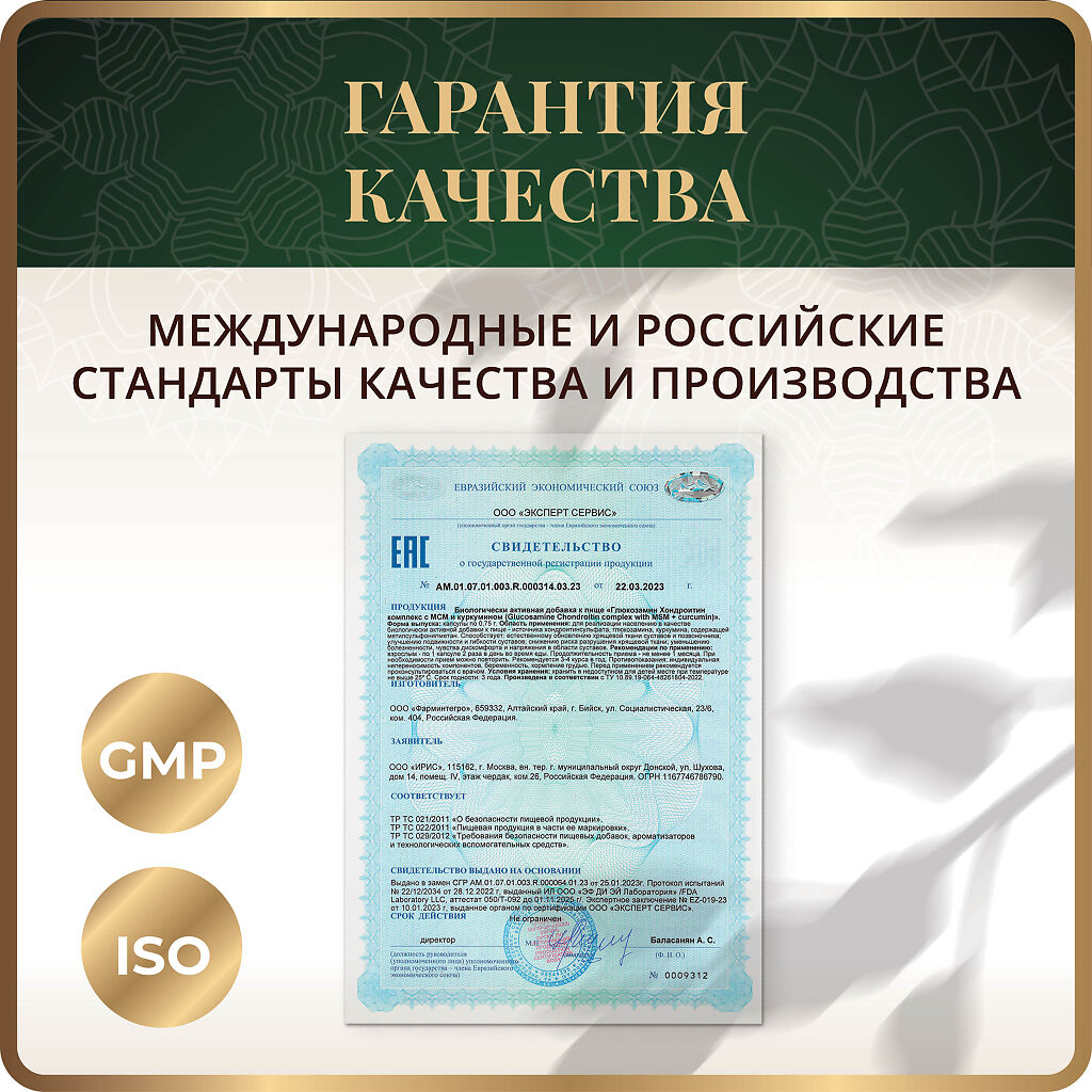 Хондроитинсульфат натрия, глюкозамина гидрохлорид, компонент капсулы: желатин; метилсульфонилметан, куркумы экстракт, стеарат магния и диоксид кремния аморфный (агенты антислеживающие).