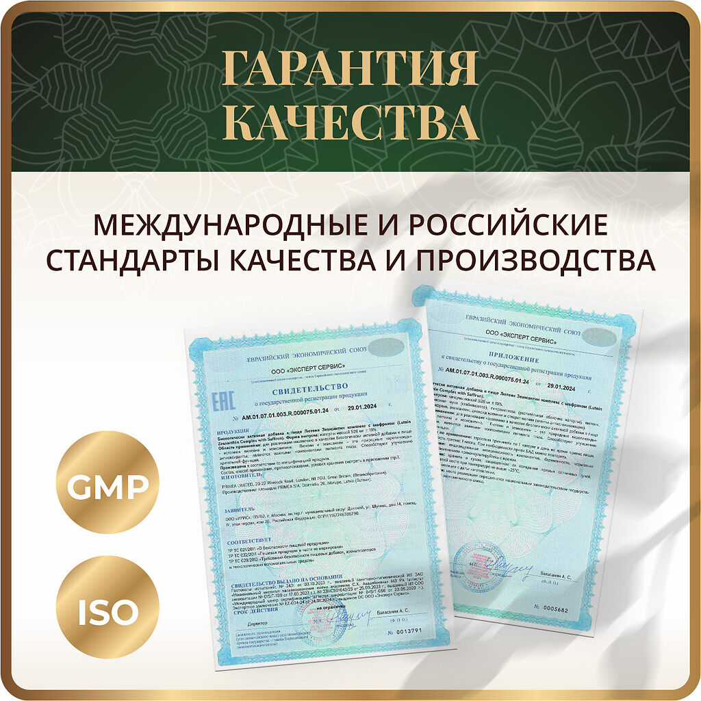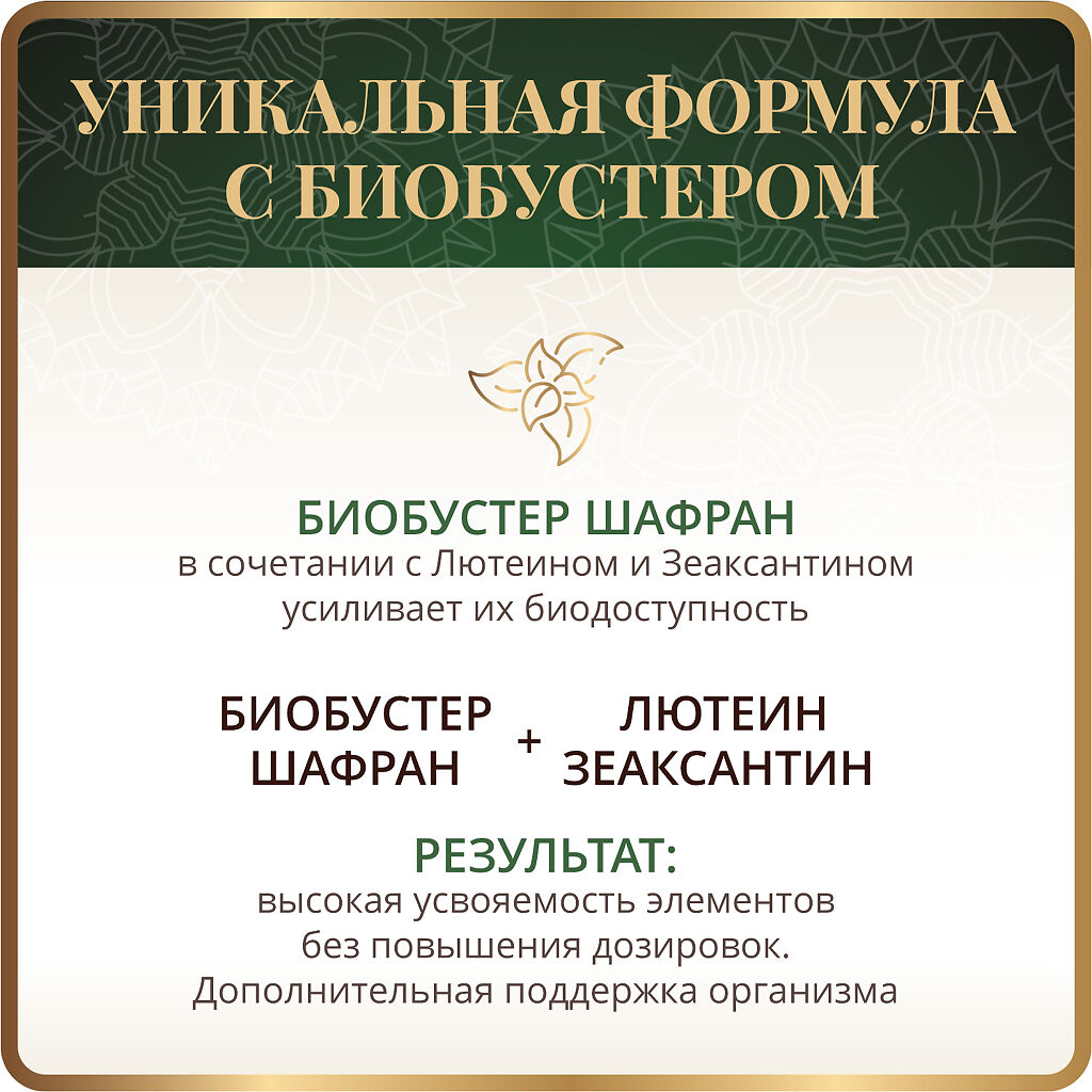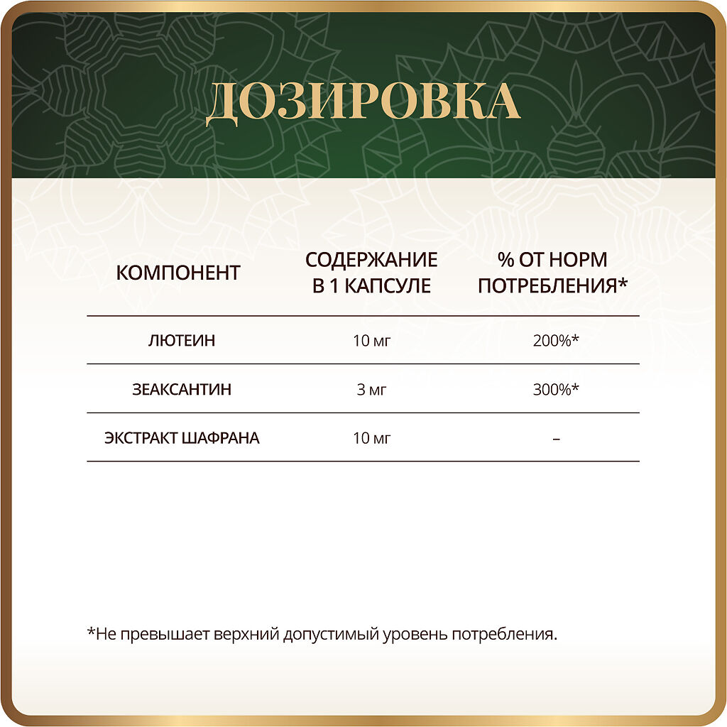Рисовая мука, диоксид кремния, стеарат магния, пропиленгликоль, экстракт корня куркумы, шафран, лютеин, зеаксантин
