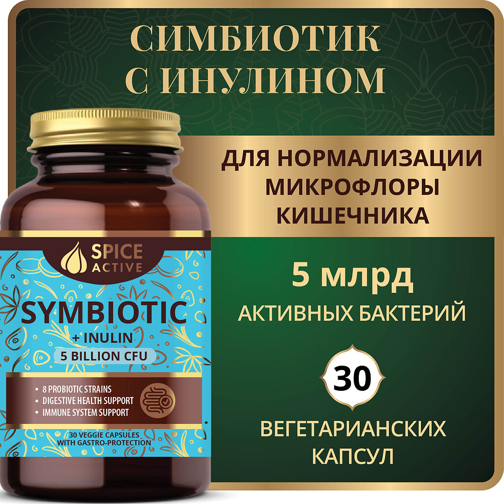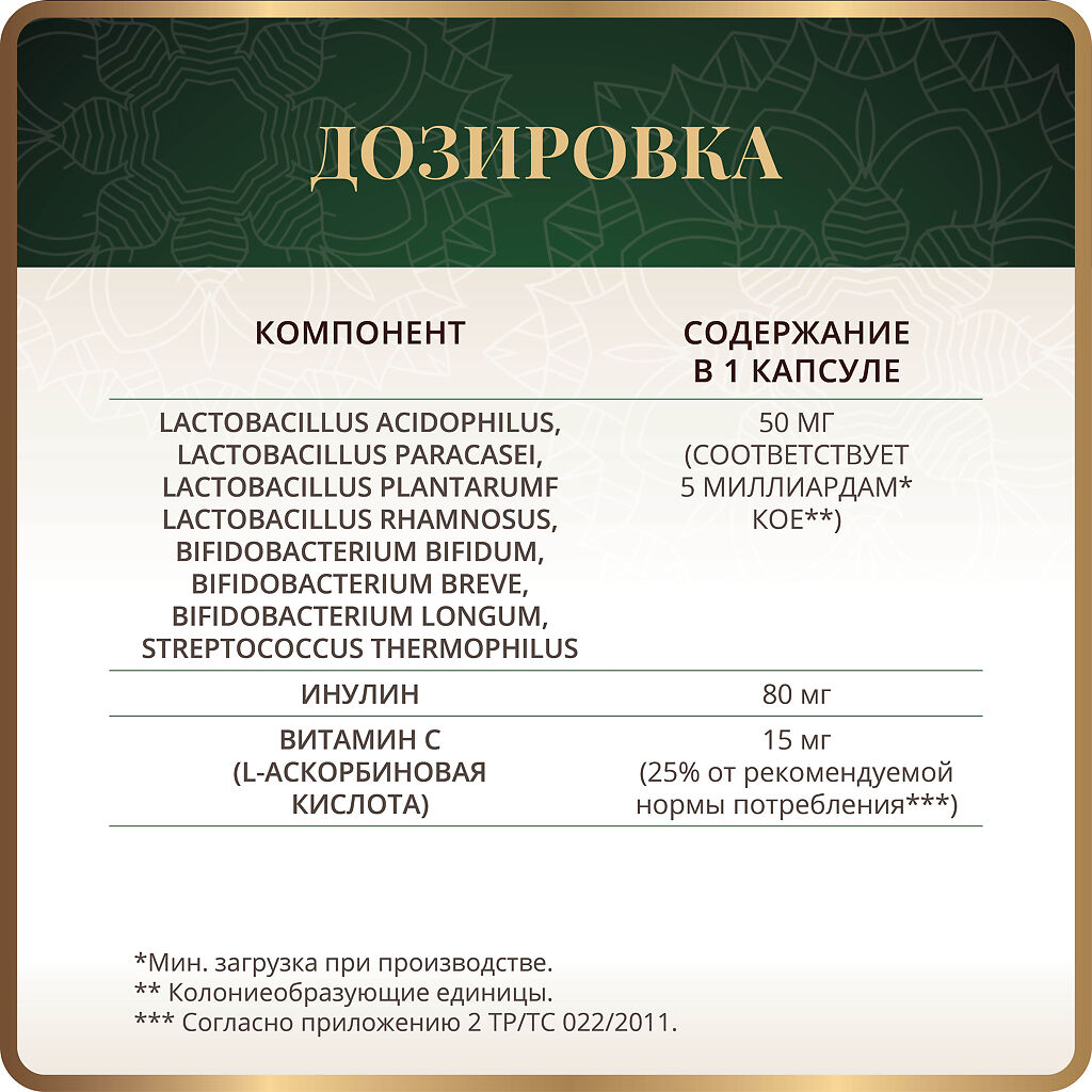 Рисовая мука, Инулин, растительная капсула (носитель гидроксипропилметилцеллюлоза), Комплекс пробиотических культур (Lactobacillus acidophilus, Lactobacillus paracasei, Lactobacillus plantarum, Lactobacillus rhamnosus, Bifidobacterium bifidum, Bifidobacterium breve, Bifidobacterium longum, Streptococcus thermophilus), L - аскорбиновая кислота, антислеживающий агенты: диоксид кремния, магниевые соли стеариновой кислоты.