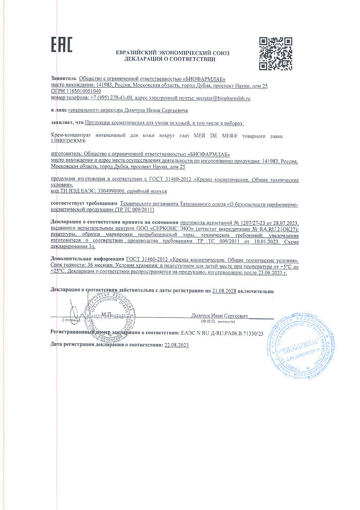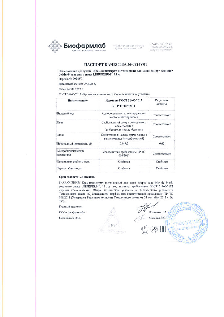 Документы Librederm Mer de Mer Крем-концентрат интенсивный для кожи вокруг глаз 15 мл 1 шт