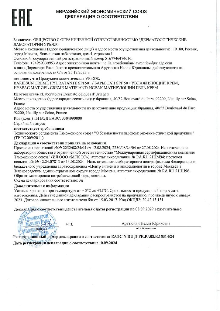 Документы Uriage Hyseac Mat Гель-крем матирующий 40 мл 1 шт