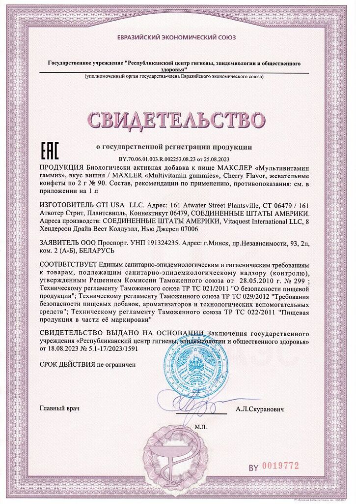 Документы Макслер Мультивитамин гаммиз вкус вишня / Maxler Multivitamin gummies Cherry Flavor жевательные конфеты по 2,0 г 90 шт 90 шт