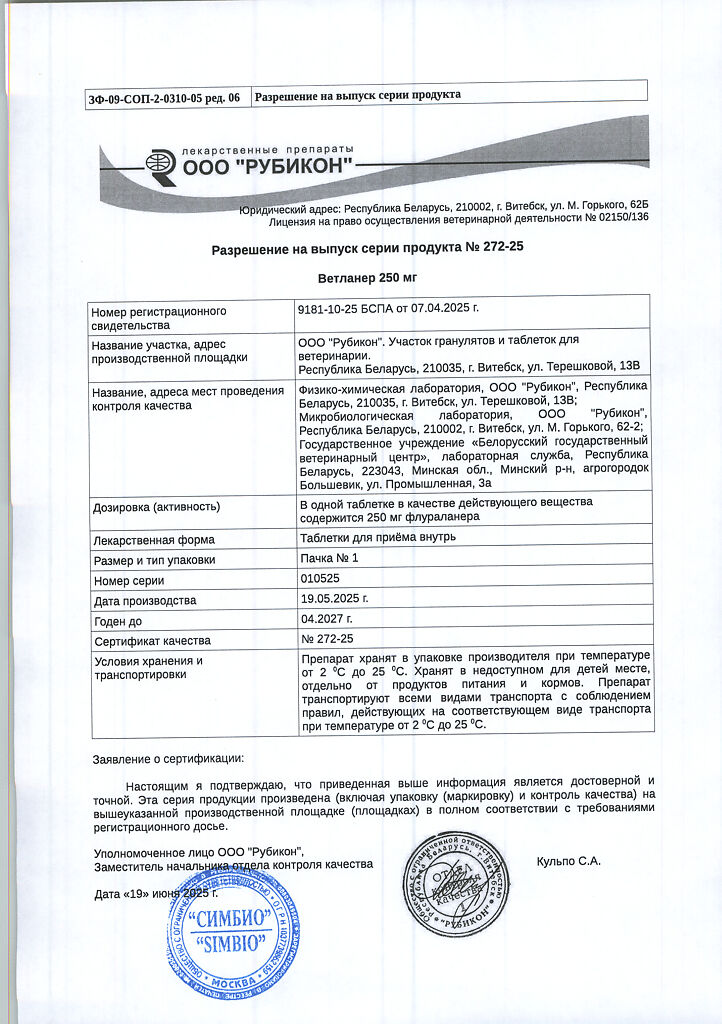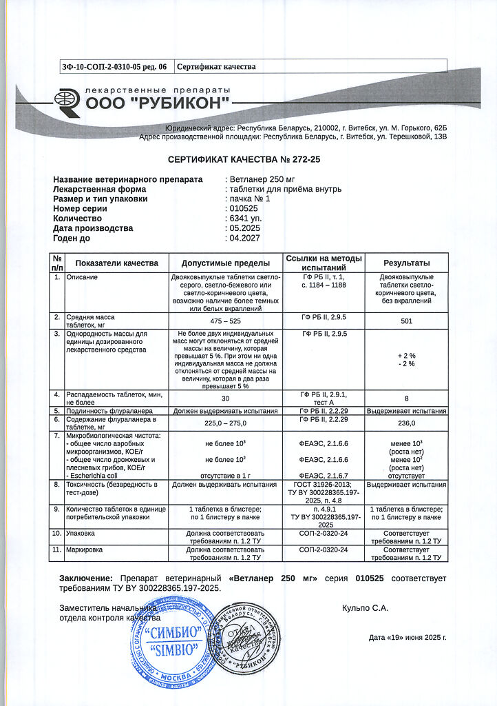 Документы ВетЛанер таблетки для приема внутрь 250 мг 1 шт (вет)