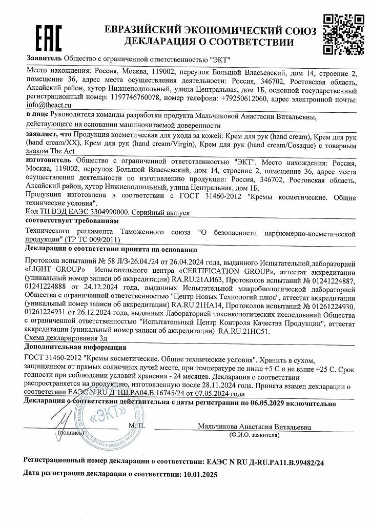 Документы The Act Крем для рук ламеллярный увлажняющий Virgin 65 мл 1 шт
