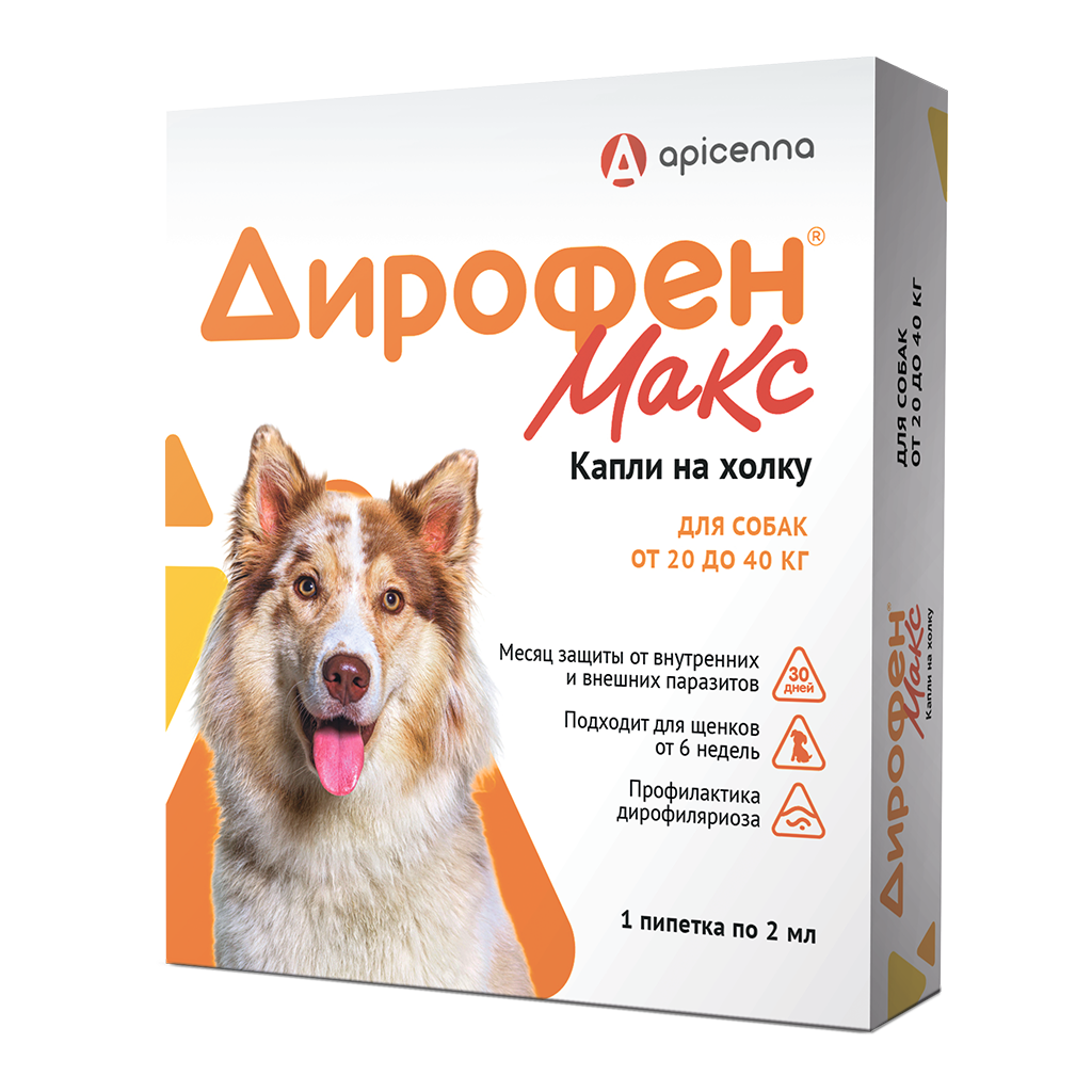 Для собак массой более 40 кг Дирофен® Макс 12 % от 360 мг Комбинация пипеток**