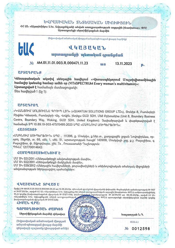 Документы Витаспектрум (Vitaspectrum) Мультивитаминный комплекс для женщин на каждый день / Every woman’s multivitamin таблетки массой 1250 мг 30 шт