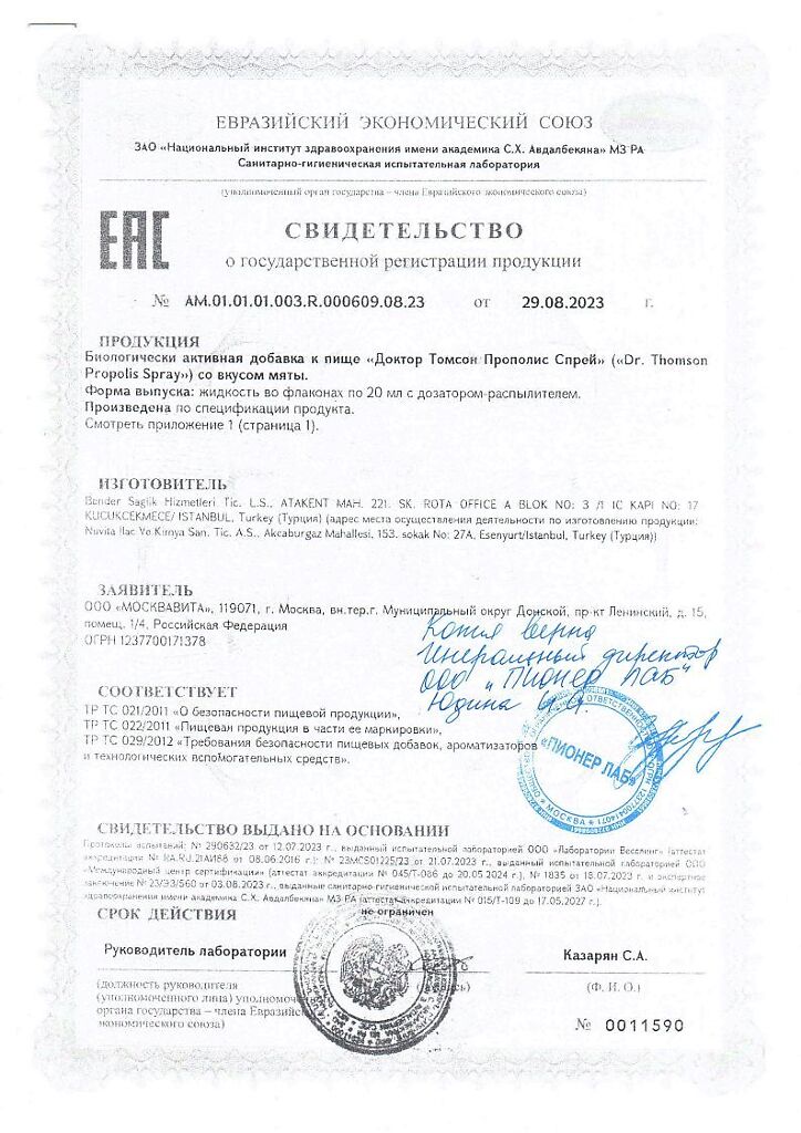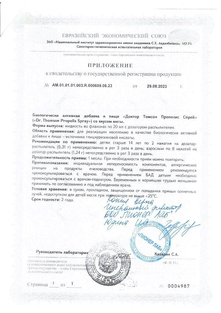 Документы Dr. Thomson Propolis Spray / Доктор Томсон Прополис Спрей со вкусом мяты жидкость во флаконах по 20 мл с дозатором-распылителем 1 шт