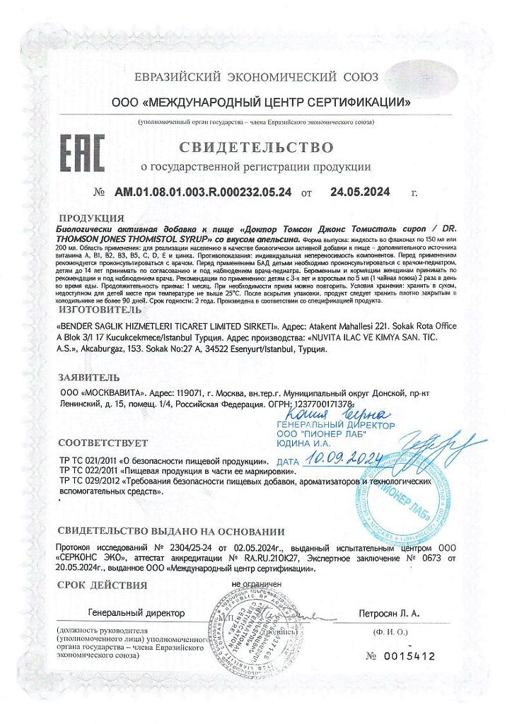 Документы Dr. Thomson Jones Thomistol Syrup / Доктор Томсон Джонс Томистоль сироп со вкусом апельсина жидкость во флаконах по 150 мл 1 шт