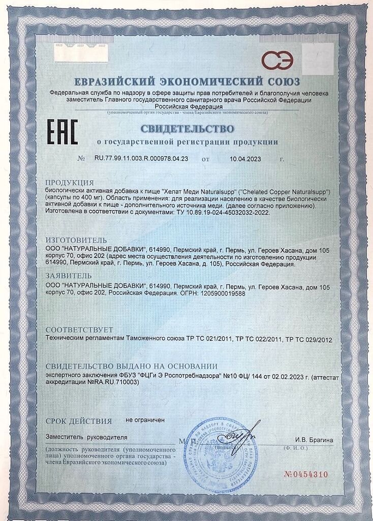 Документы NaturalSupp Хелат меди/Chelated Copper Naturalsupp капсулы по 400 мг 60 шт